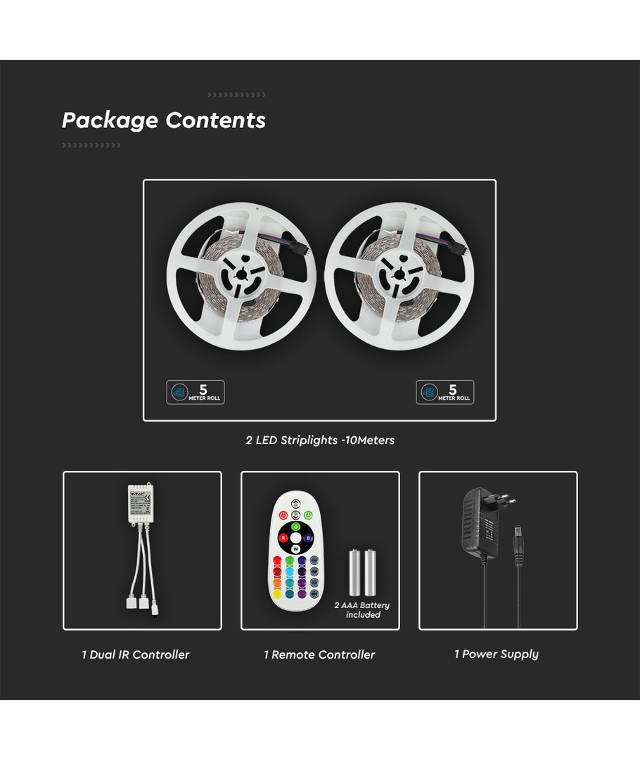 Upplev ett komplett ljusupplevelse-set med vårt 10m (2x5m) RGB strip set, som inkluderar både fjärrkontroll och strömförsörjning, idealiskt för att skapa stämningsfull belysning i hemmet.