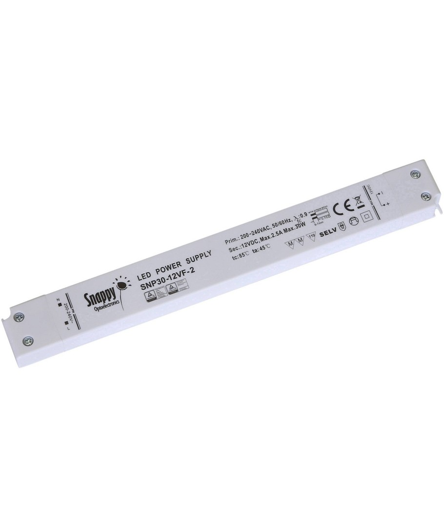 30 watt SLIM 12V LED Driver/strömförsörjning från Snappy. Det perfekta valet för LED lampor och LED strips, eftersom den genom en specialdesignad krets både sparar energi och samtidigt förlänger LED lampornas livslängd.