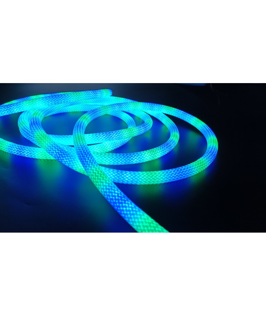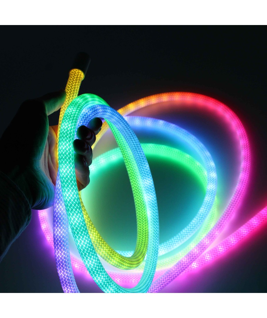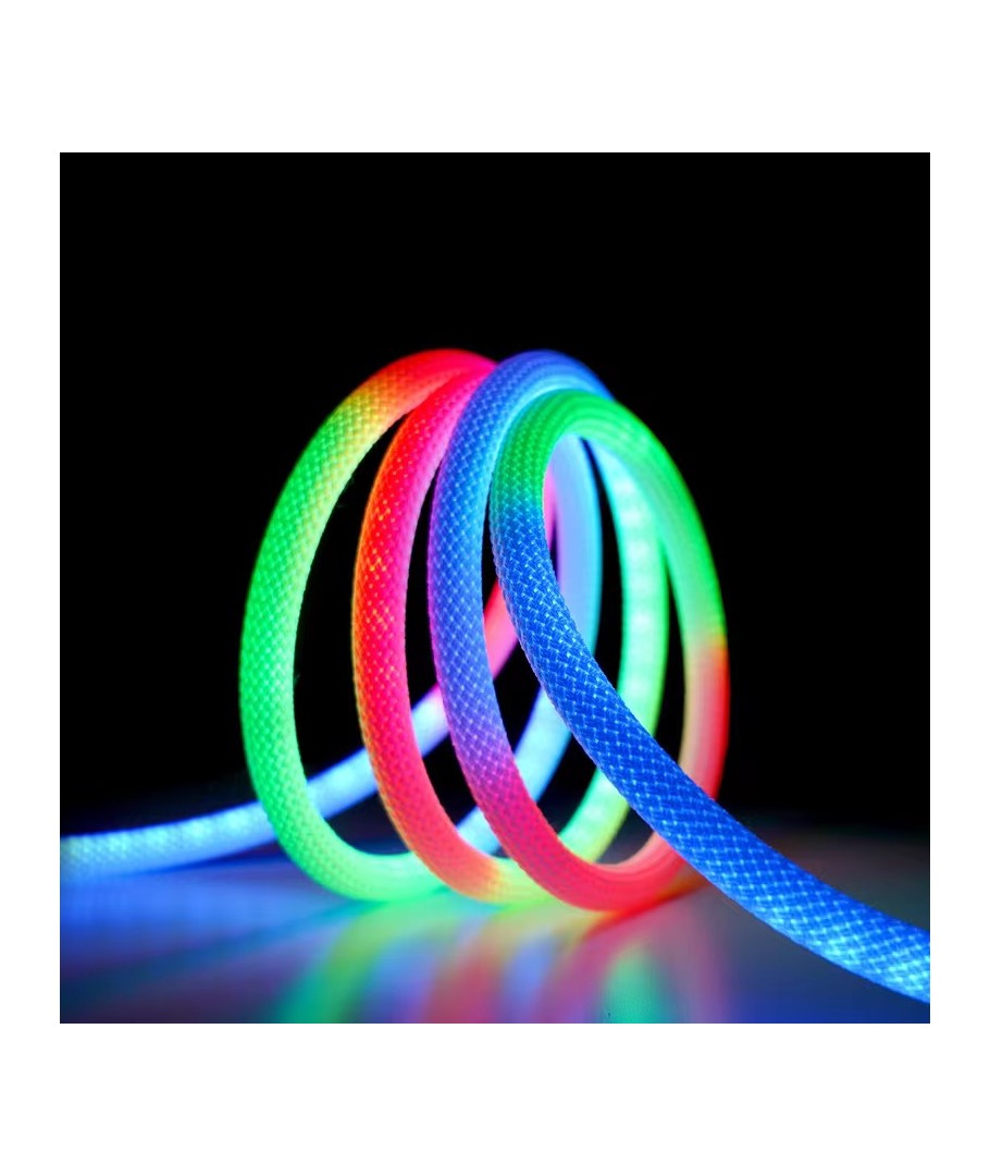 Upplev en värld av färger med vår 3W/m RGBIC Neon Flex strip med vävt rep - en 5 meter RGBIC neon flex, som ger ljus och liv till vilket rum som helst med sitt dynamiska färgspel och flexibla design.