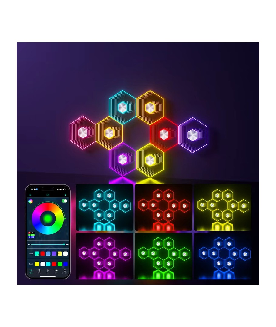Perfekt för både dagligt bruk och speciella tillfällen, blir varje stund minnesvärd med detta lysande konstverk. Oavsett om du lyser upp ditt eget hem eller ger bort i present, kommer RGBIC Hexagon Infinity Väggljus att förvandla varje rum med sin moderna charm och teknologiska briljans.