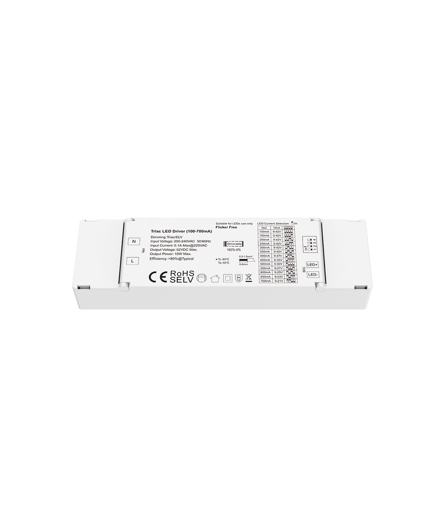 Justerbar till ett brett utbud av strömutgångar, från 100mA till 700mA, se tabellen nedan.