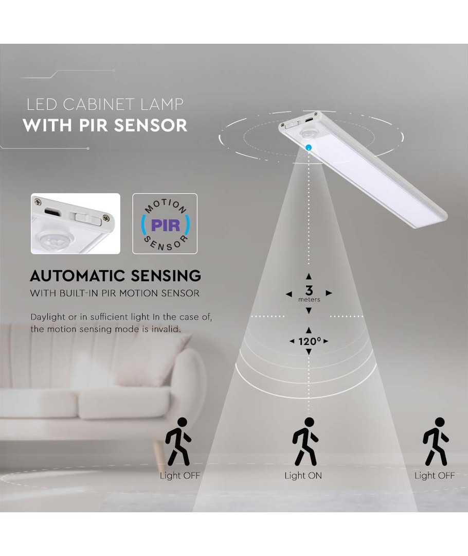 Lampan inkluderar en PIR-sensor som reagerar på rörelse, vilket gör den till en energieffektiv lösning genom att släcka lampan automatiskt när ingen närvaro upptäcks. Med dimensionerna 400 x 9 x 40 mm är den diskret och lätt att installera i olika typer av skåp och hyllor. Notera att den har en skyddsklassning på IP20, och är därför inte vattentät.