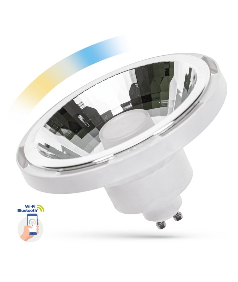 Smart Home AR111 spot med GU10 fatning med möjlighed för justering av både ljusfärgen och ljusstyrkan.