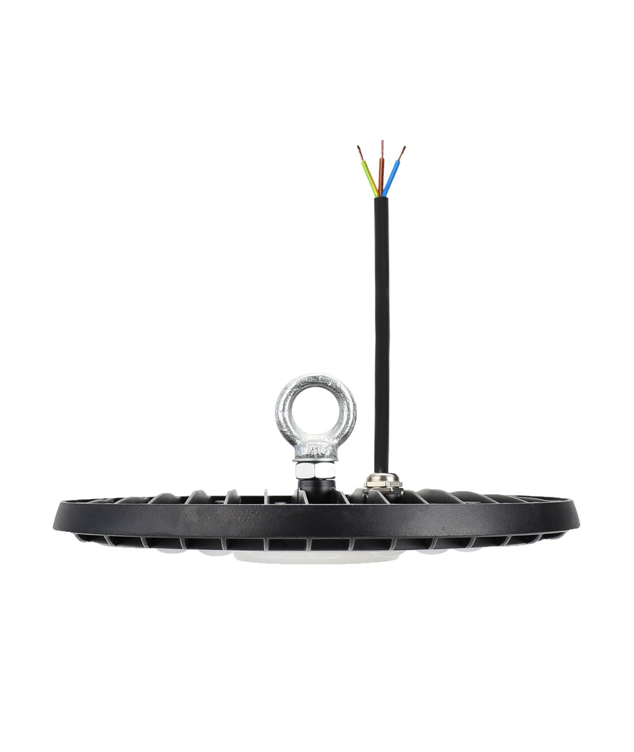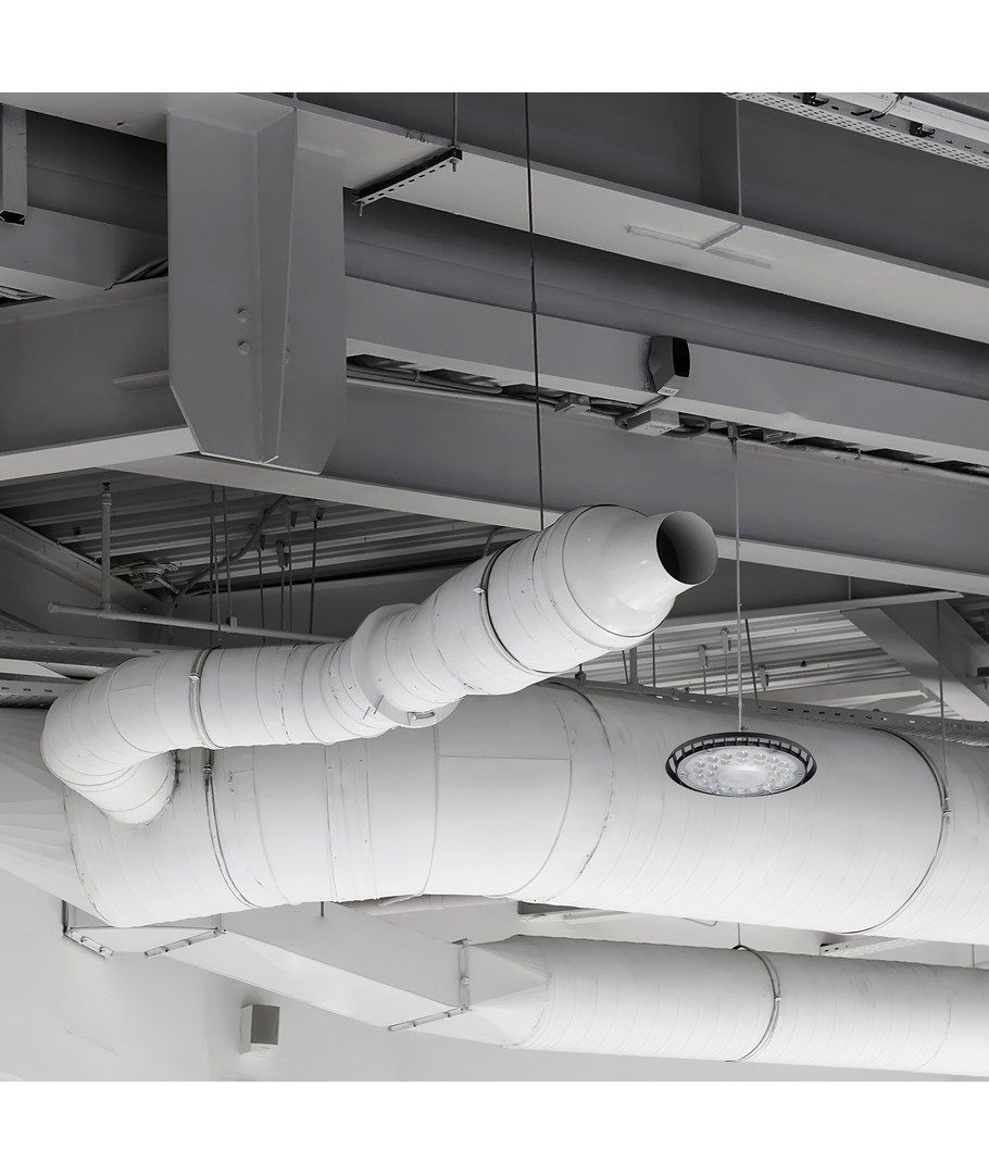 Denna high bay-lampa är konstruerad för att klara tuffa förhållanden med en robust IP65-klassning, vilket gör den lämplig för användning utomhus i regniga eller dammiga miljöer. Dess IK06-skydd säkerställer också att den tål mekanisk påverkan och stötar, vilket gör den idealisk för industrier och lager.