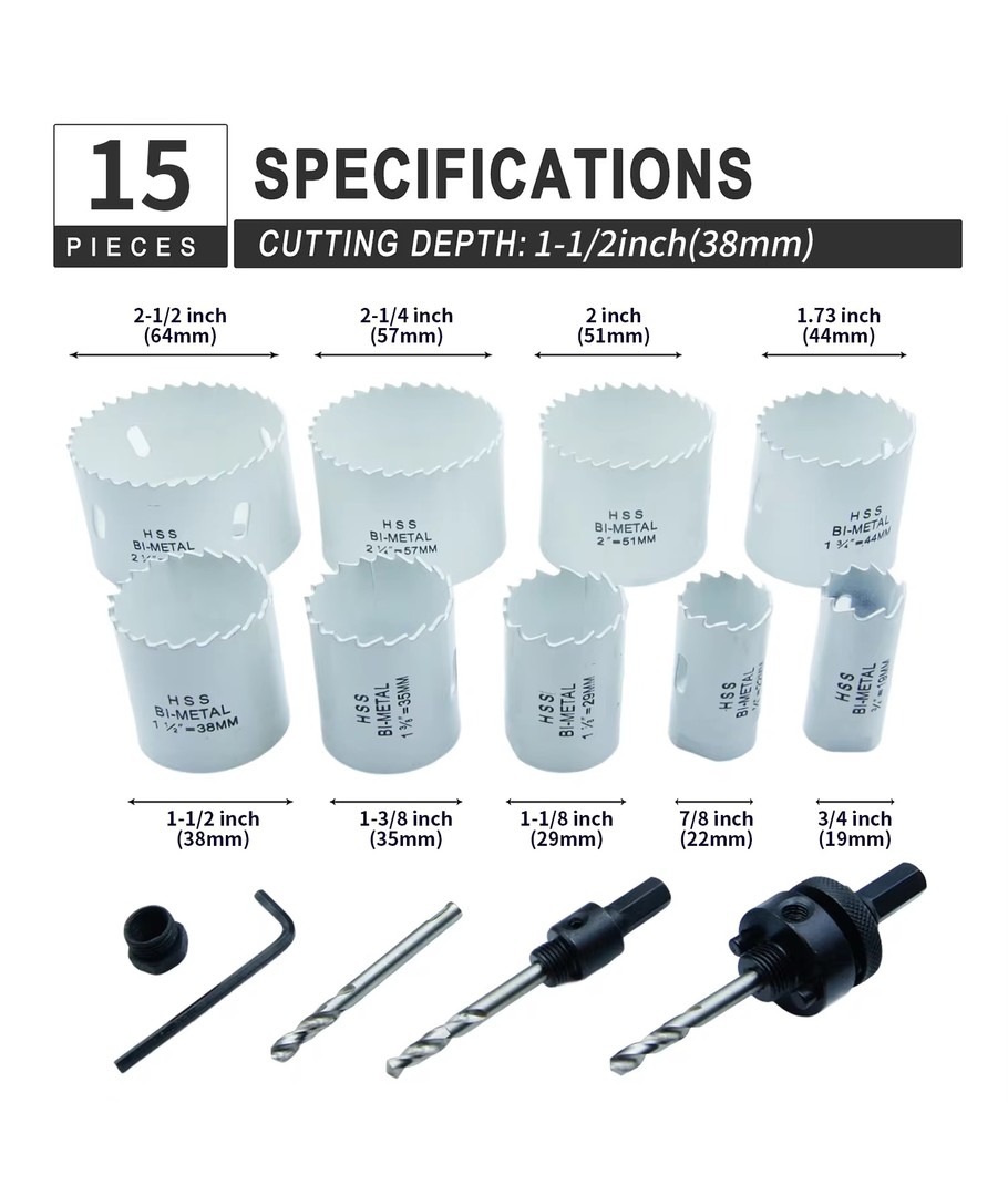 Sats med 15 st. hålsåg/koppsåg för t.ex. montering av infällda spotlights.
