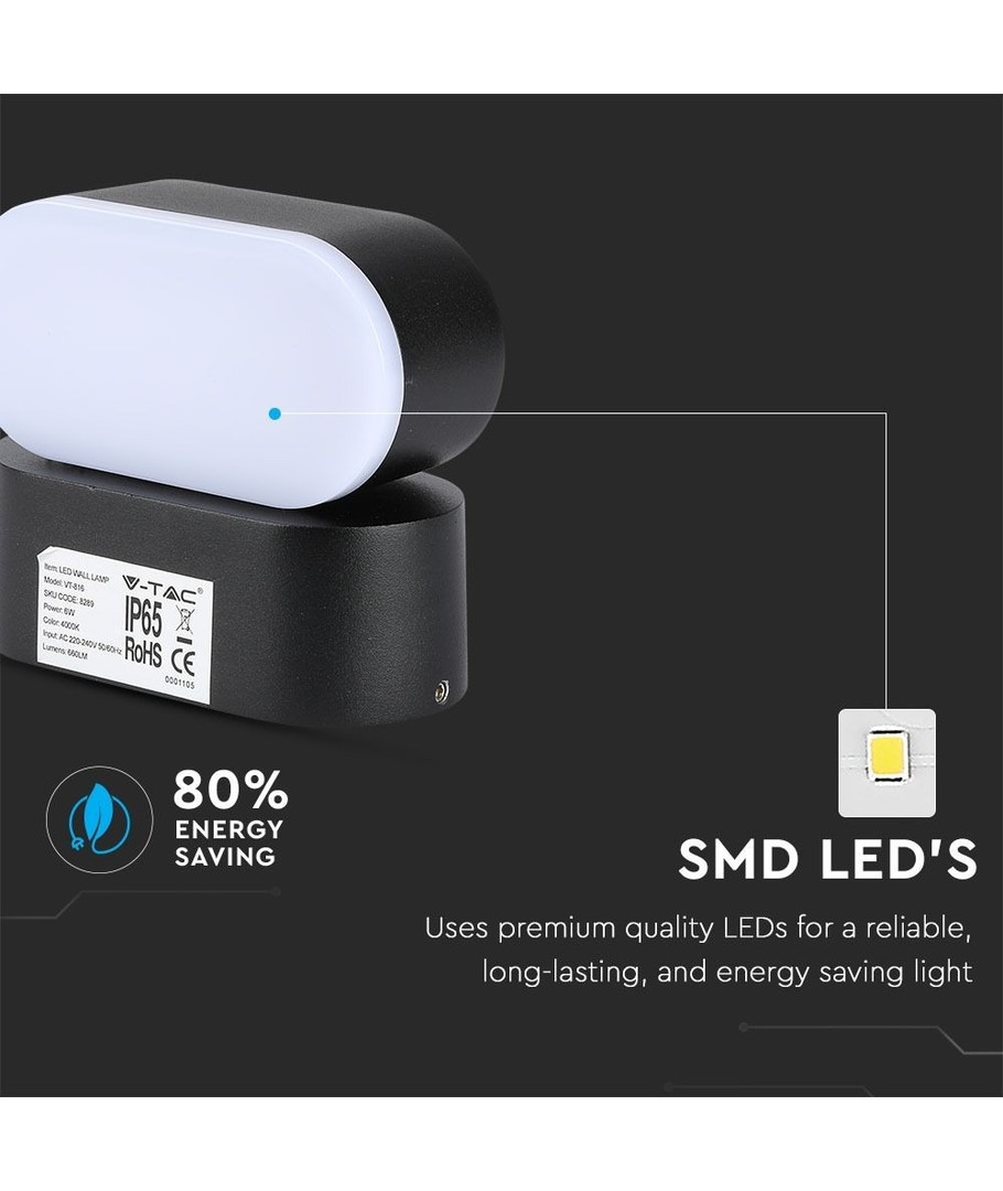 V-Tac 6W LED svart vägglampa är ett energieffektivt och kostnadseffektivt val för att belysa såväl inomhus- som utomhusmiljöer.