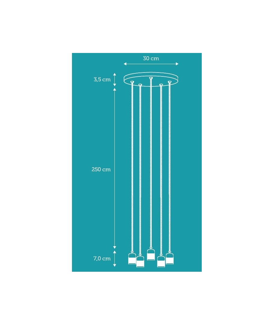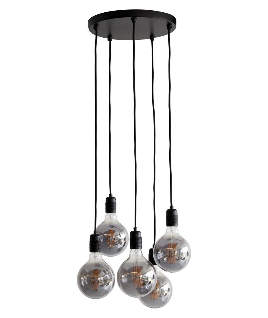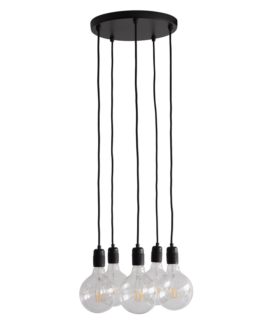 De 5 enskilda socklarna hänger från takkoppen i varsin vacker, svart textilkabel på 2,5 meter.