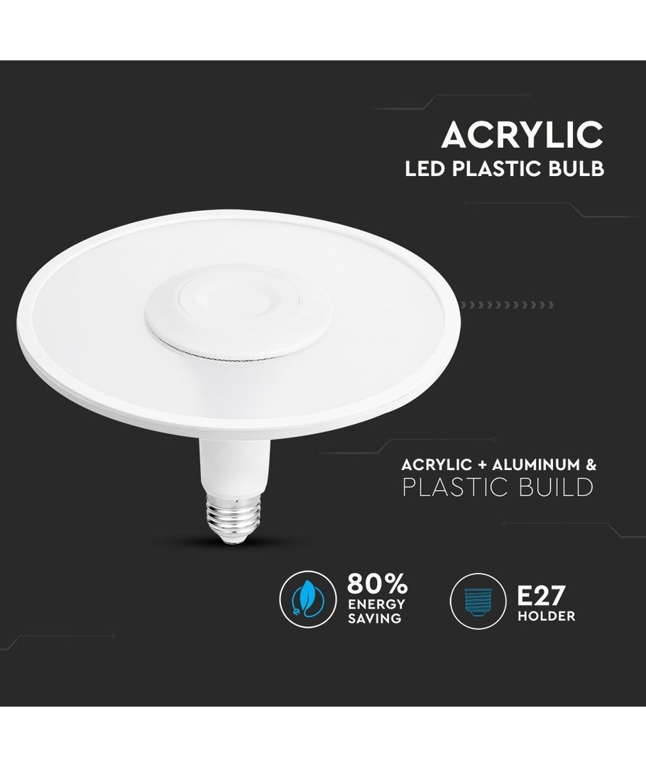 UFO LED-lampan är utformad för att ge en jämn och bred ljusfördelning med sin 120 graders spridningsvinkel. Denna funktion säkerställer att hela rummet får en jämn belysning utan mörka fläckar, vilket gör den idealisk för hemmiljöer, kontor och allmänna utrymmen.