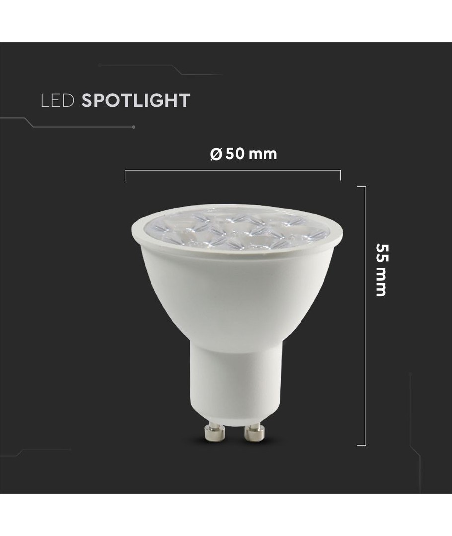 Denna spot mäter 55 x Ø50 mm och är designad för att anslutas direkt till 230V. Det gör installationen enkel och kompatibiliteten hög.