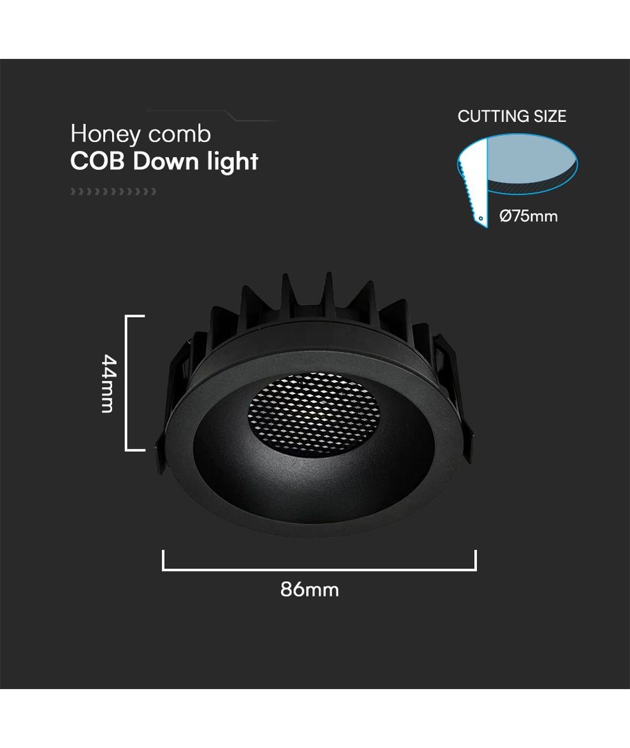 Upplev en enastående ljuskvalitet med vår 12W Bländfri RA90 CCT Downlight. Denna downlight kombinerar funktionalitet och design med sin svarta front och honeycomb-mönstrade struktur för att minska bländning.
