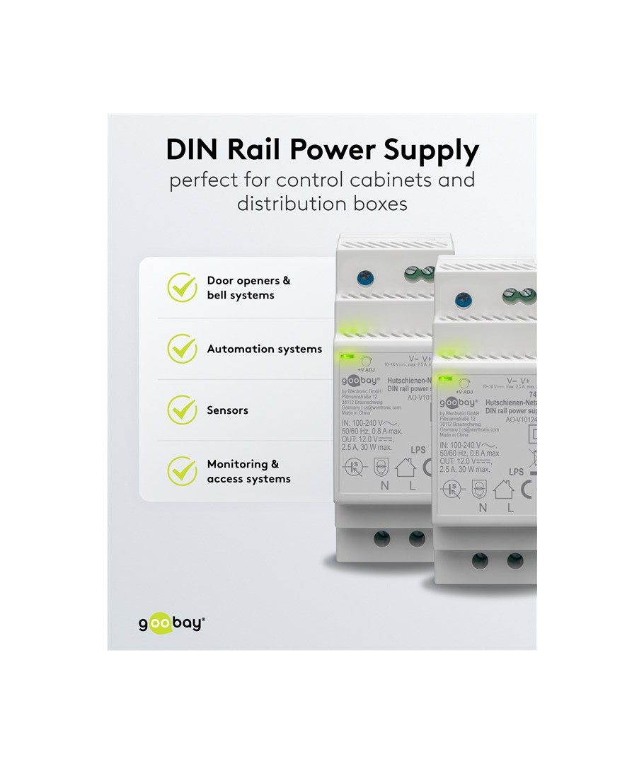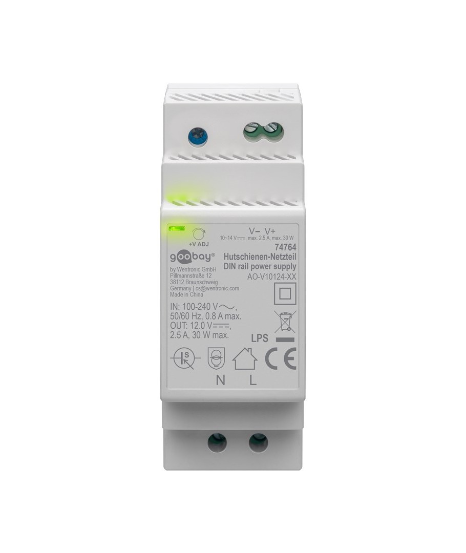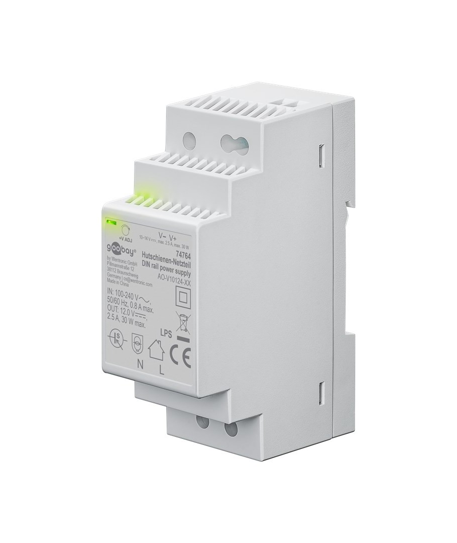 12V DC 2,5A strömförsörjning för DIN-skena montering.