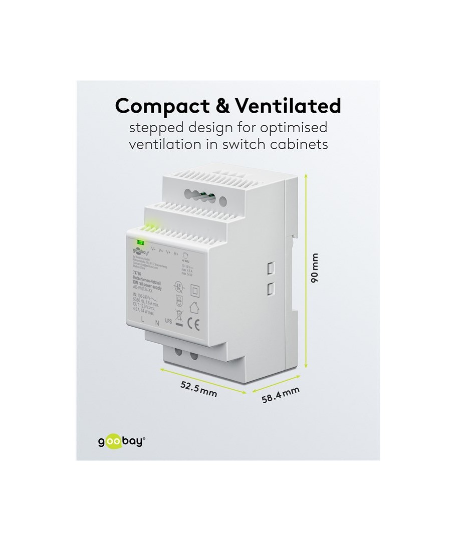 Med sin DIN-skena montering blir installationen snabb och enkel. Du kan enkelt placera och säkert installera strömförsörjningen i ditt elsystem tack vare dess kompakta dimensioner på endast 52,5 x 90 x 58,4 mm.