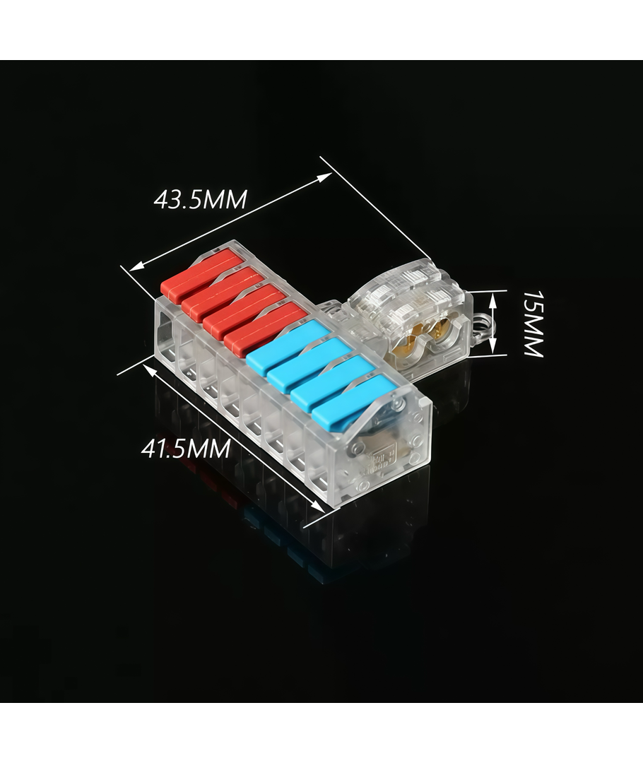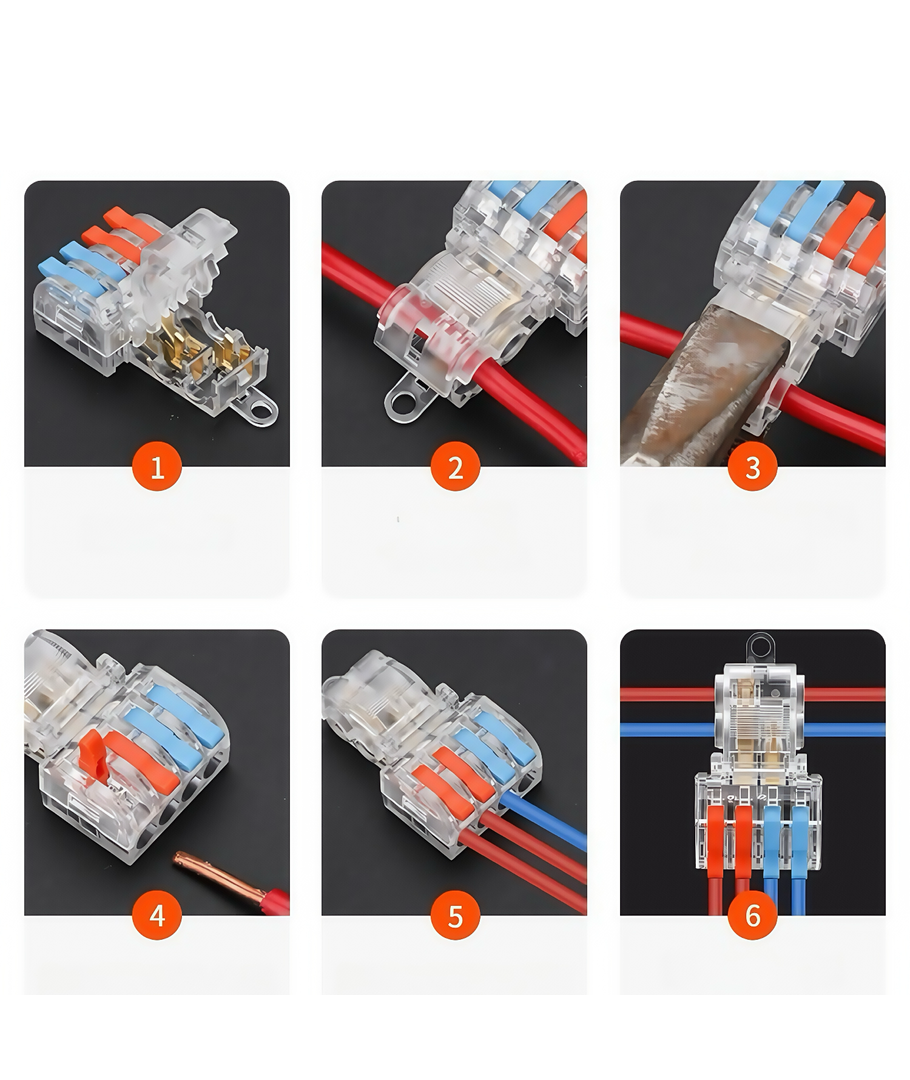 De har ett praktiskt anslutningssystem, med orange/blå vippbygel, som gör det enkelt att få in de mjuka ledarna i hålen.