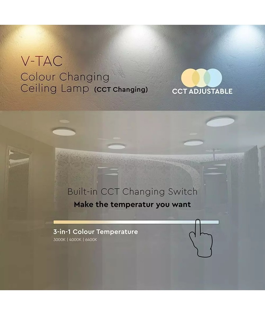 Tack vare CCT-tekniken kan du enkelt justera mellan tre olika ljusfärger för att skapa den perfekta atmosfären för varje tillfälle. Växla mellan varmt, kallt eller neutralvitt ljus med en enkel knapptryckning.