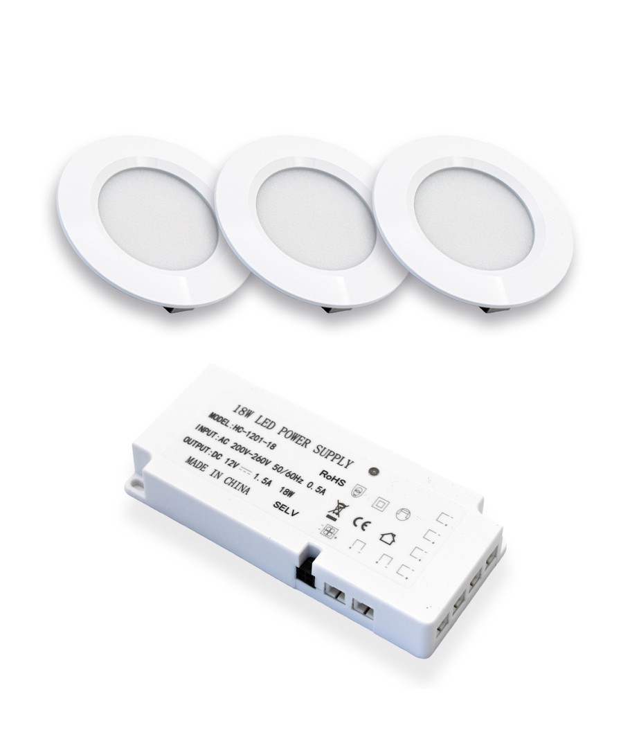Med detta set får du 3 st. Reco68 möbelspots i vitt, samt 12V DC strömförsörjning, med plats för 6 möbelspots.
