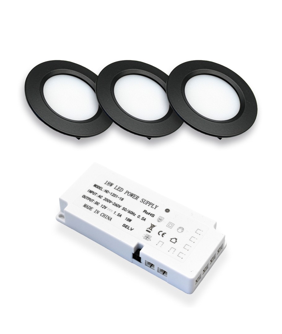Med detta set får du 3 st. Reco68 möbelspots i svart, samt 12V DC strömförsörjning, med plats för 6 möbelspots.