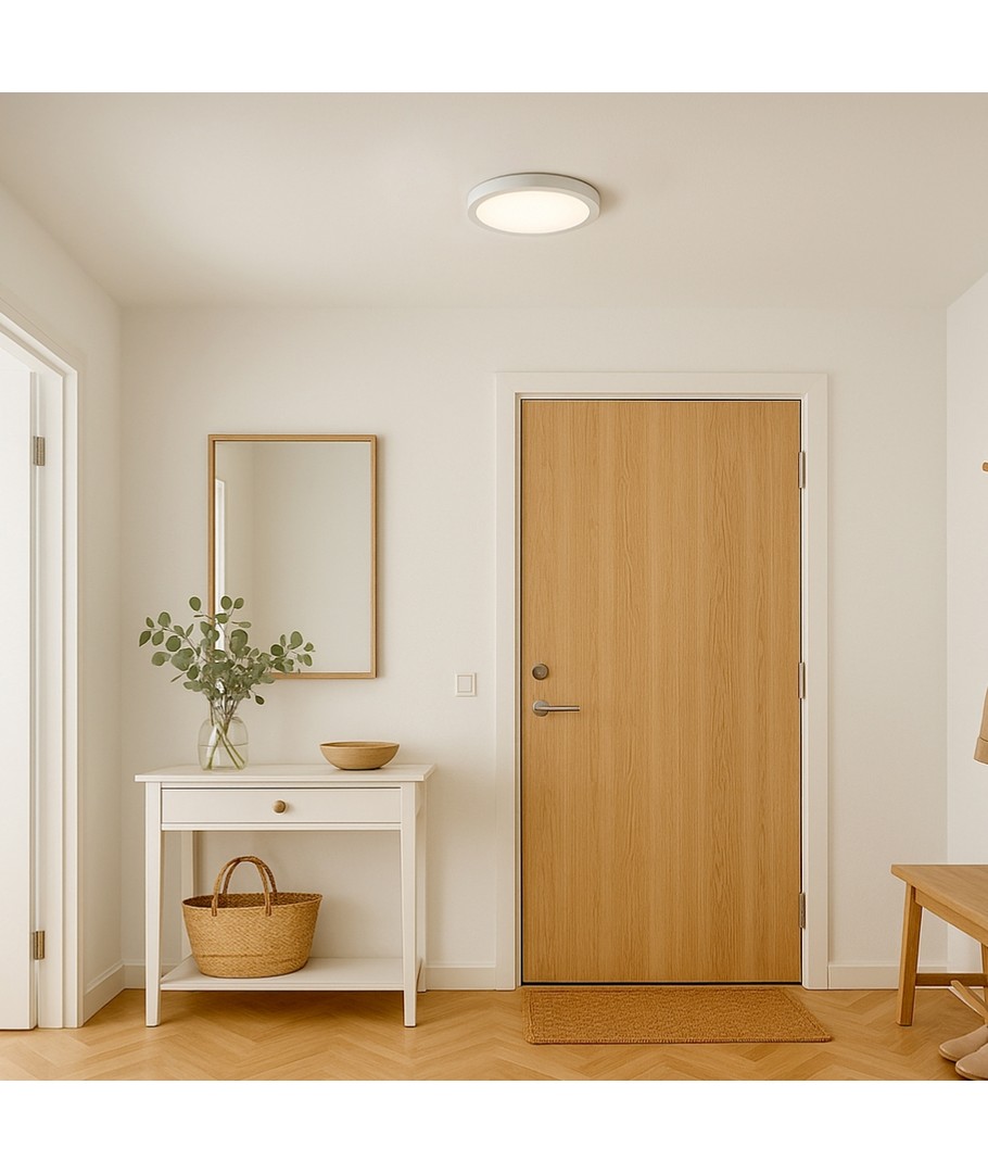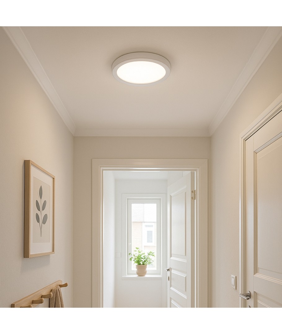 Denna LED taklampa erbjuder modern belysning med en effekt på 18W och en stilren vit kant som smälter in i alla interiörer. Tack vare sin diskreta design med en höjd på endast 3,9 cm och en diameter på 22,5 cm är lampan ett utmärkt val för alla rum.
