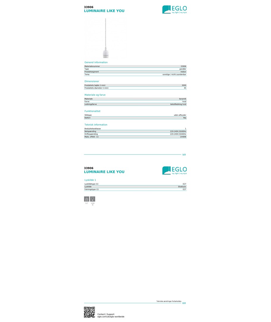 D.C Pendel Ø18 G9, vit / ek