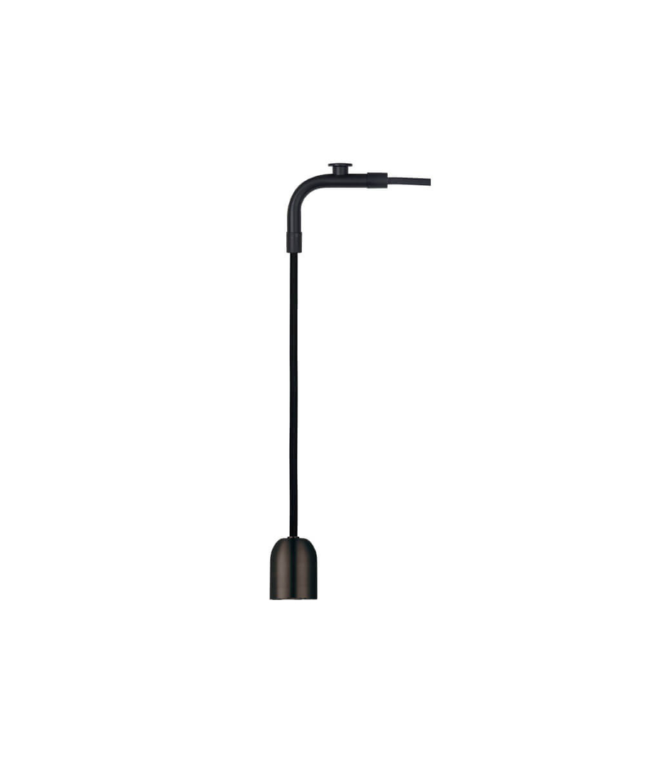 En fatning i stærk sort metal, en lang sort stofledning på 4 meter, samt en fin svanehals til at montere det hele loftet.