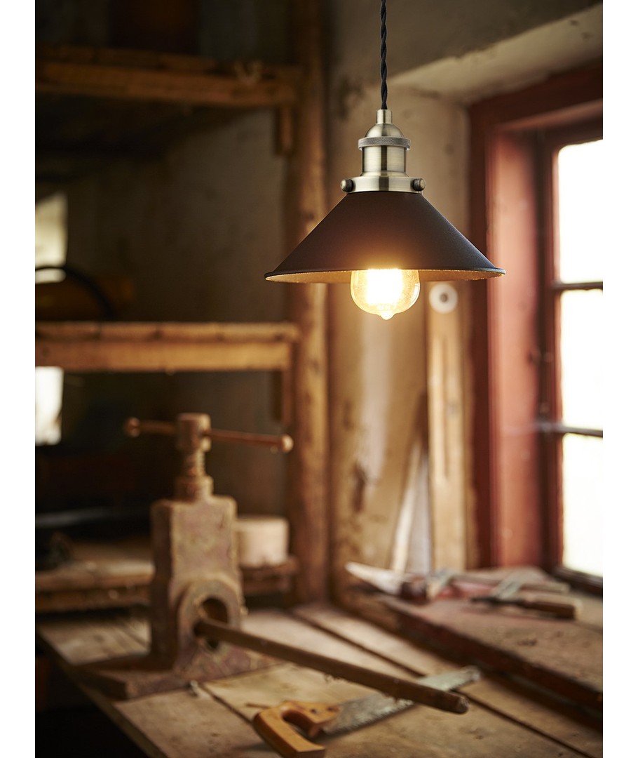 Levereras med 2,5 m svart tvinnad tygsladd samt en snygg baldakin för upphängning i taket. Du kan justera längden på sladden via baldakin, så om du önskar att sladden ska vara kortare.