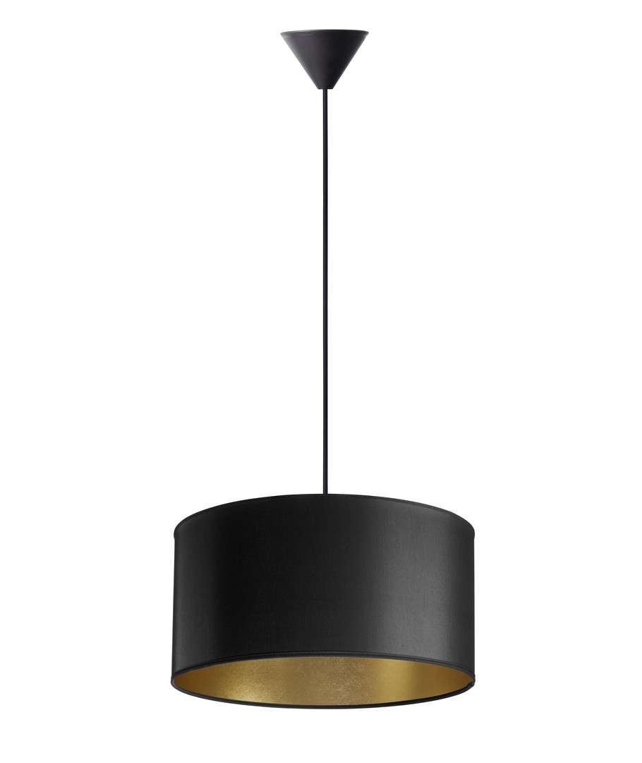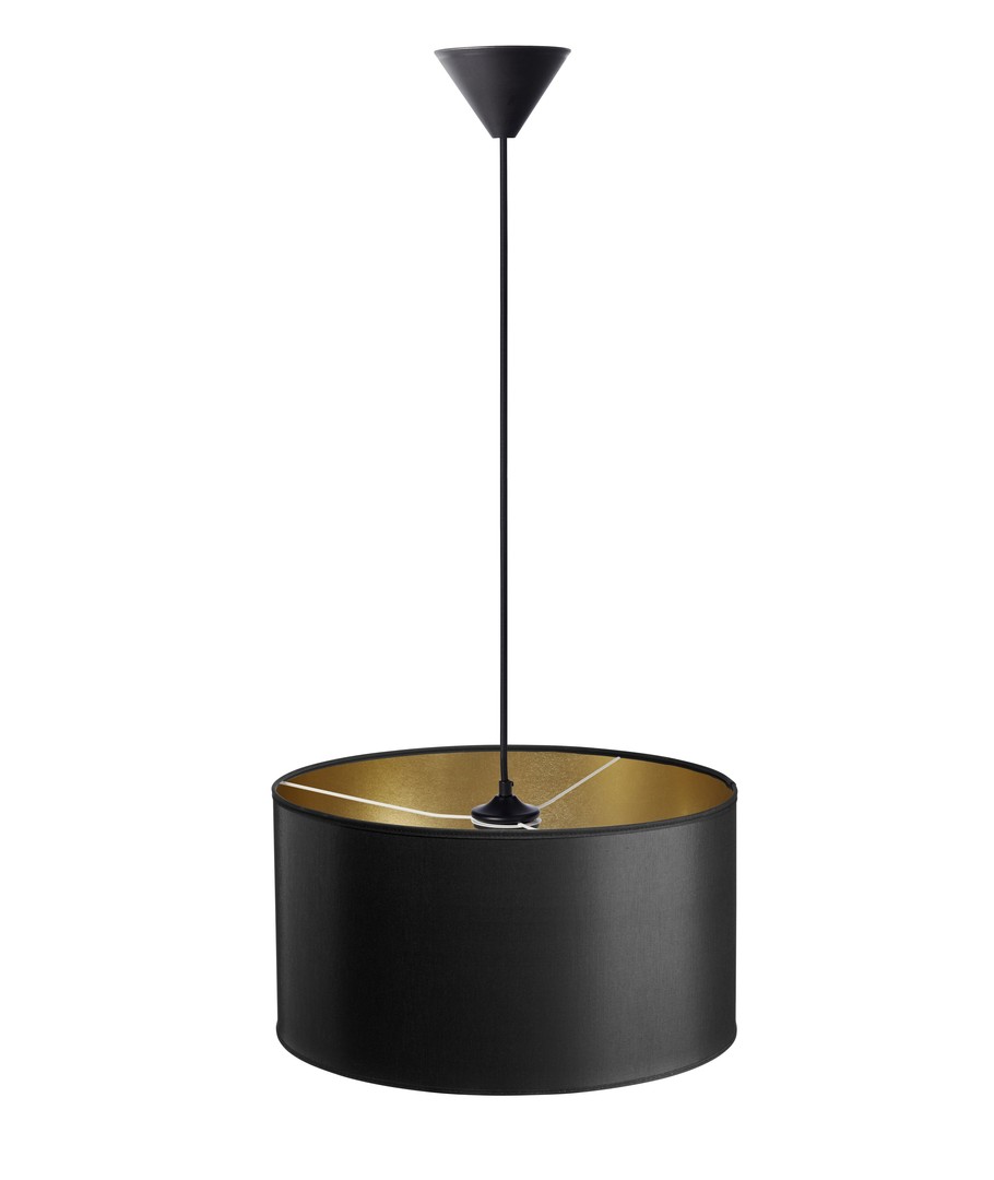 Lätt och elegant pendellampa från danska Nielsen Light, som är guldfärgad på insidan och klädd med svart tyg på utsiden.
