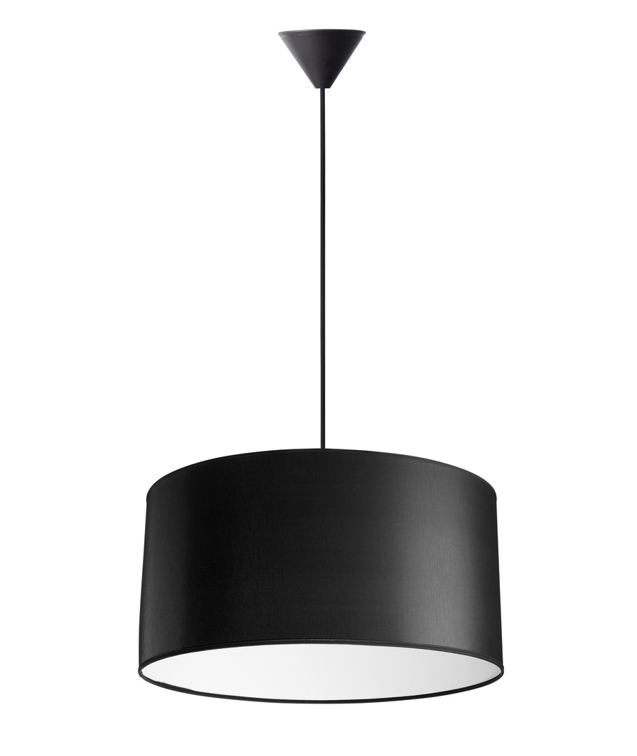 Lätt och elegant pendellampa från danska Nielsen Light, som är vit på insidan och klädd med svart tyg på utsidan.