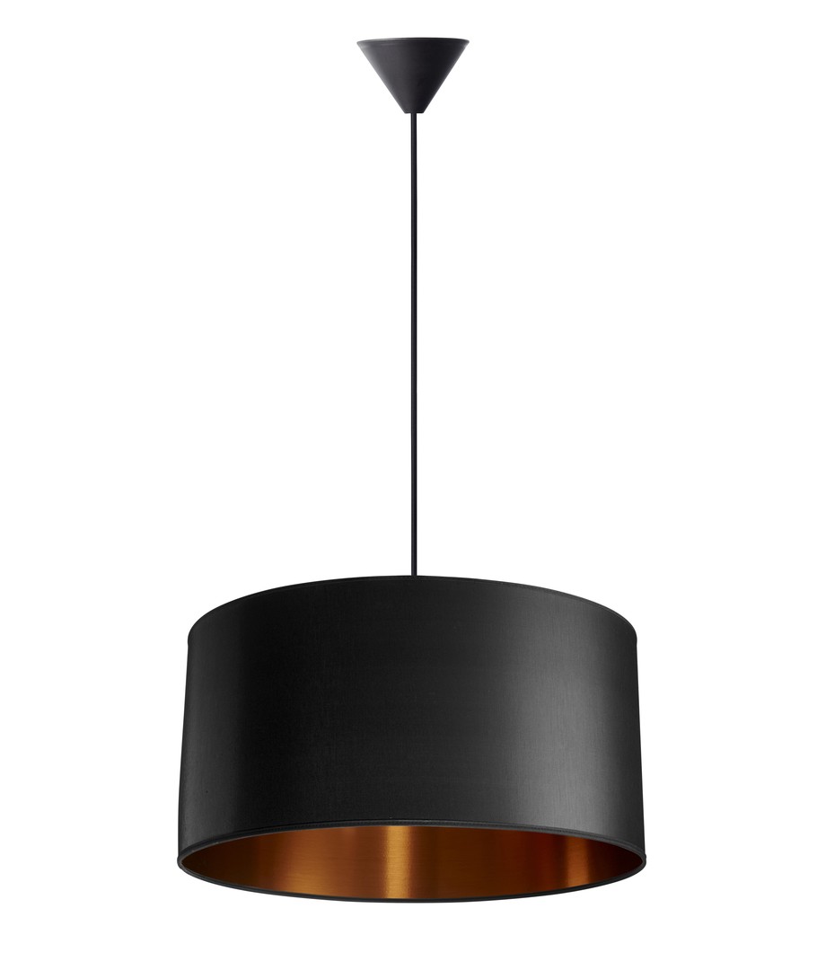 Lätt och elegant pendellampa från danska Nielsen Light, kopparfärgad på insidan och svart tyg på utsidan. Noir-look. 500x250 mm. E27 sockel.