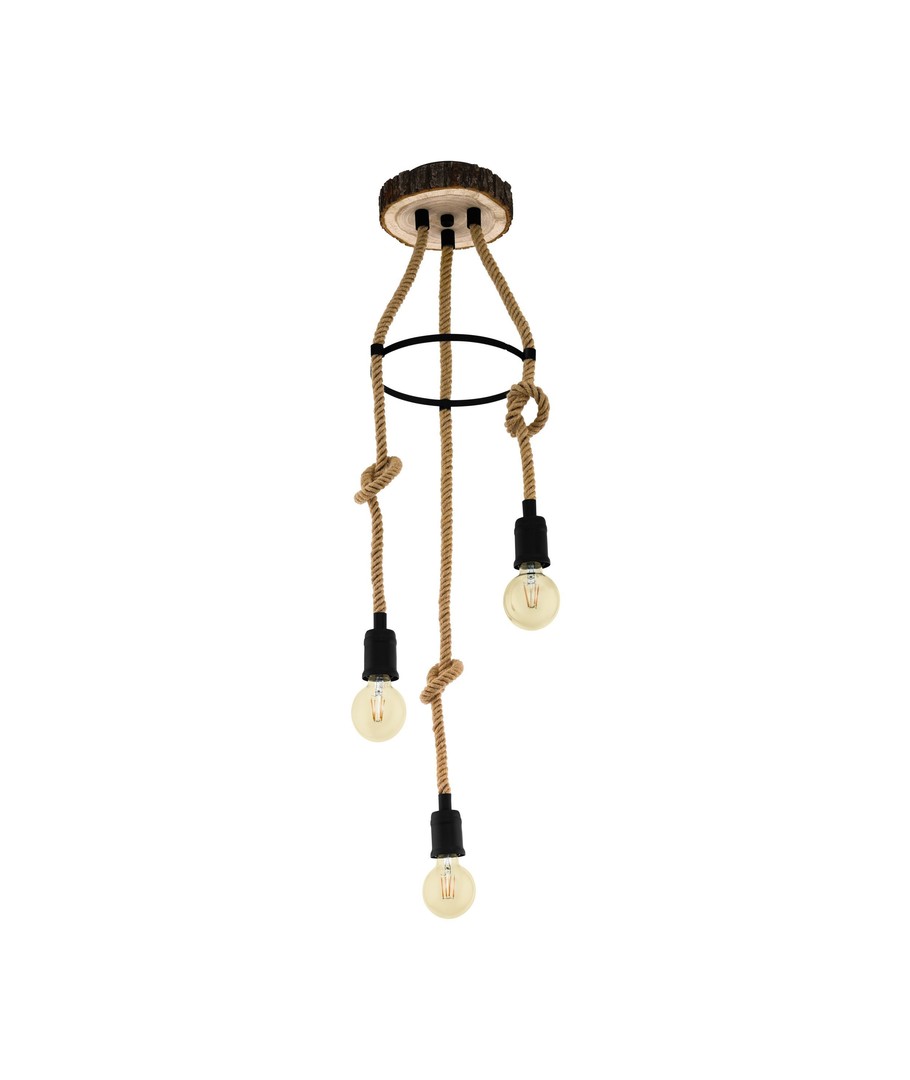 3 stk. E27 fatninger af sort stål er fastgjort til nogle tykke, gammeldags reb.