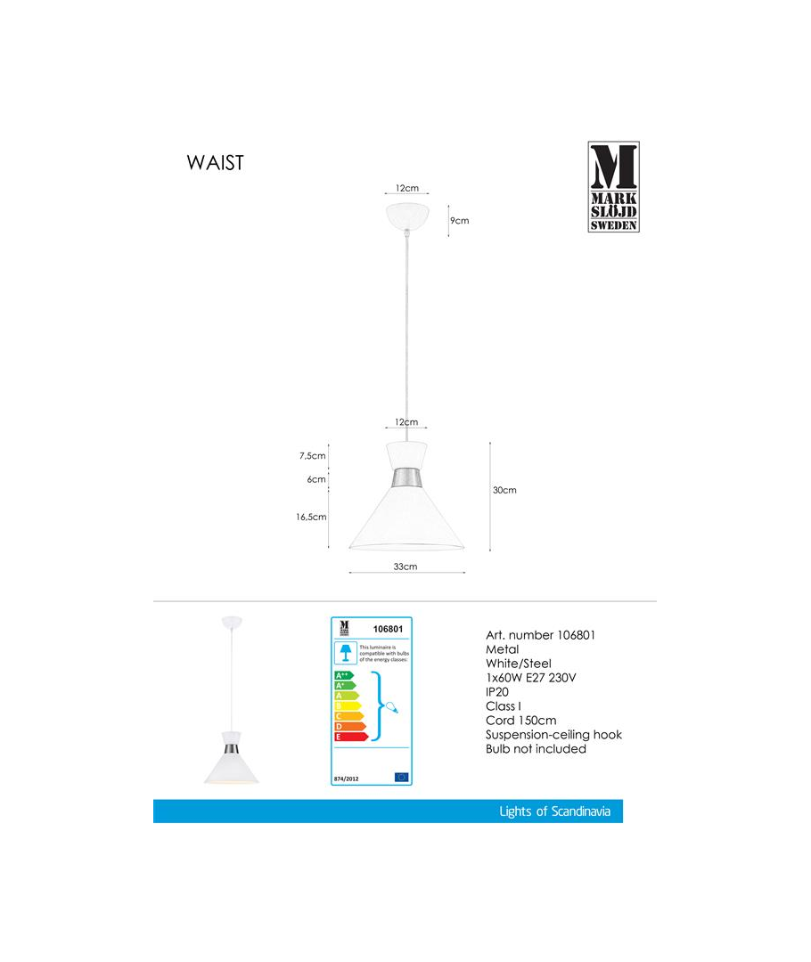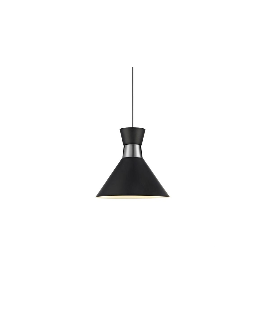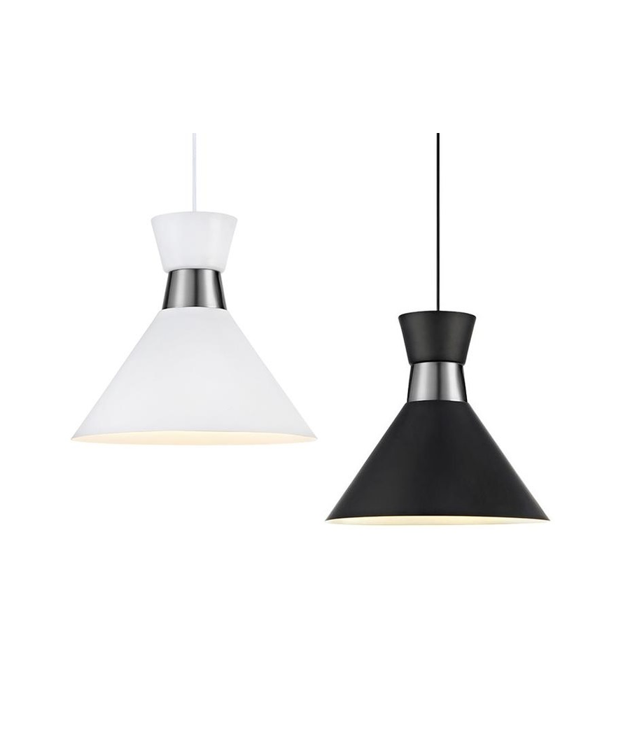 Classic pendel lampe i metal og farven sort/krom eller hvid/krom, som går godt i spænd med den Danske stil. Lampen har en diameter på 33 cm. og har en højde på 30 cm.