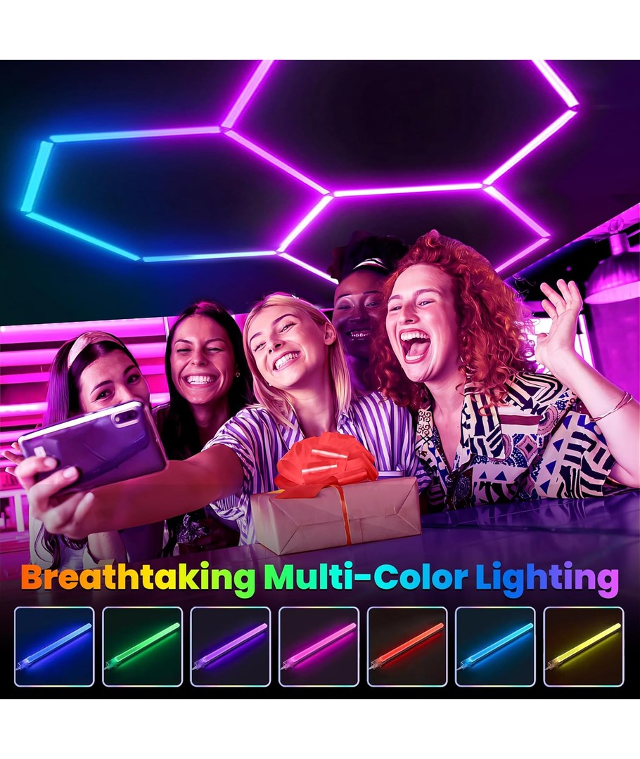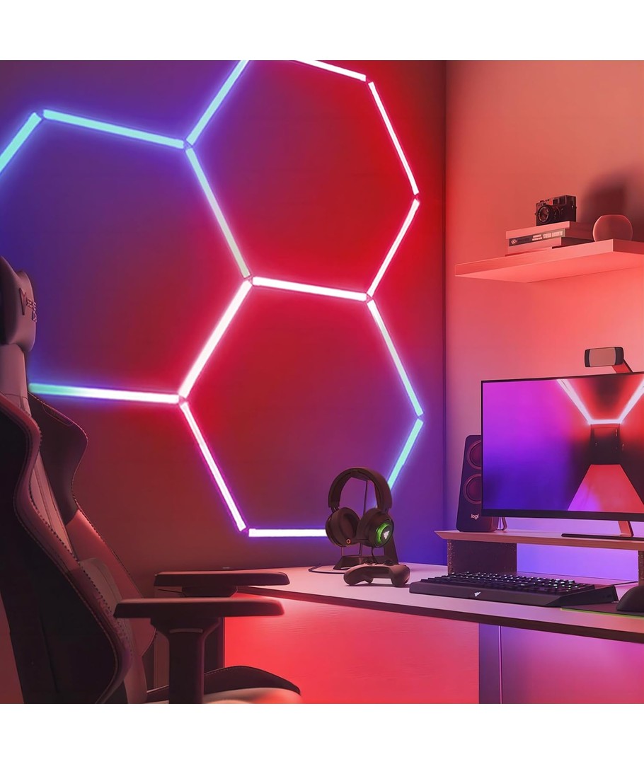 Detta moderna belysningsset erbjuder en innovativ lösning för både dekorativ och funktionell belysning i ditt hem. Med sina unika sexkantiga design och avancerade teknologier, ger detta RGBIC-system en anpassningsbar ljusdisplay som omedelbart förhöjer atmosfären i vilket rum som helst.