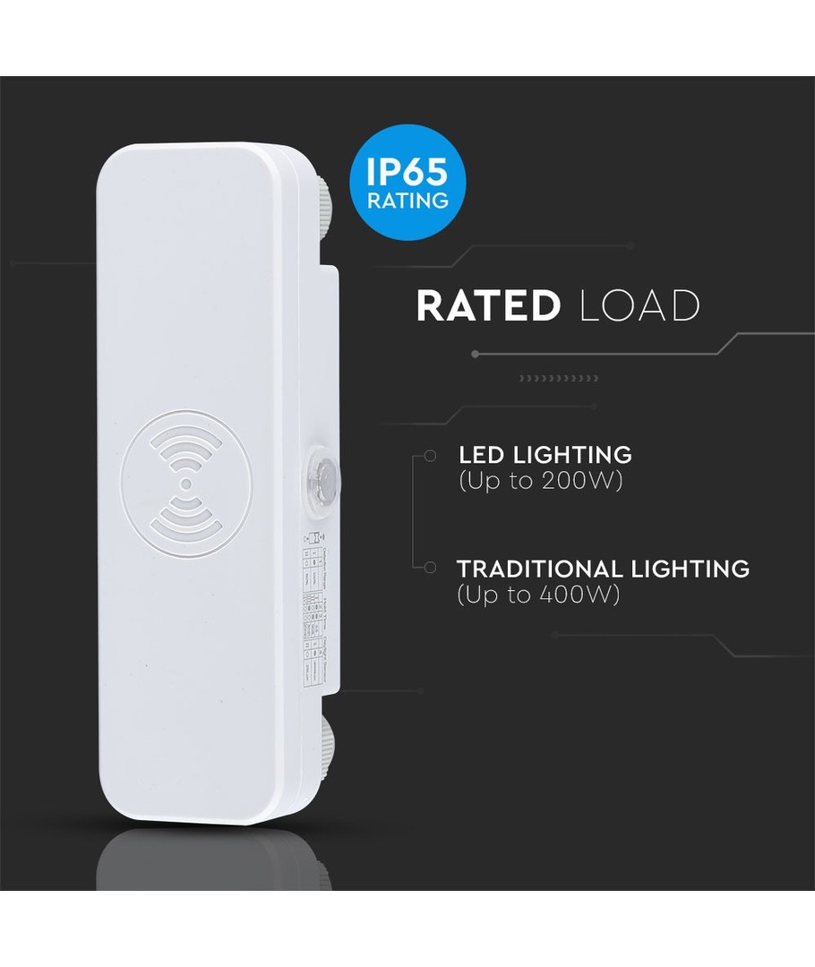 Den vita mikrovågssensorn är en avancerad rörelsesdetektor som är utformad för att leverera pålitlig och effektiv ljusstyrning i både inomhus- och utomhusmiljöer.