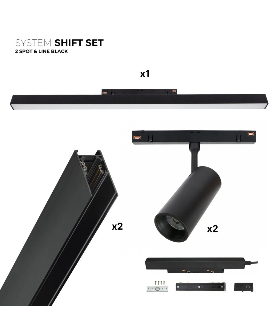I detta SHIFT-set får du 2x 1 meters skenor, 2 LED-spots och en ljusskena, samt allt du behöver för att installera setet.