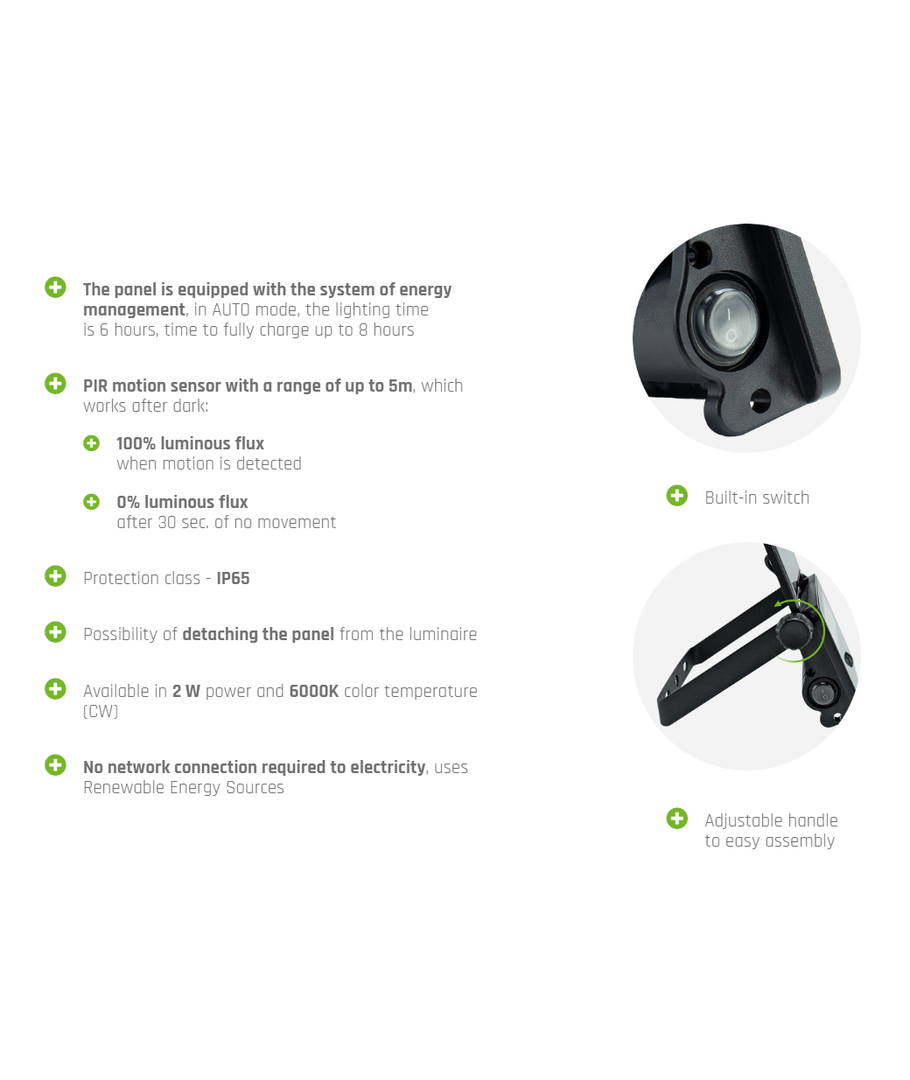 Med en bred spridning på 110 grader säkerställer denna solcellstrålkastare en jämn fördelning av ljuset. Oavsett var du placerar den, kan du vara säker på att de mest använda områdena av din utomhusmiljö kommer att vara väl belysta.