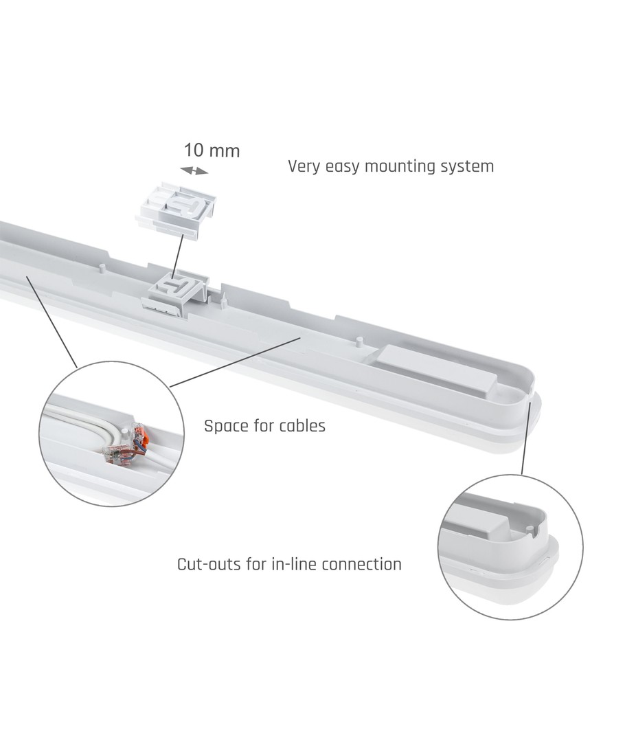 Neutralvin LED-ljus i denna armatur erbjuder en perfekt balans för arbetsmiljöer, med en ljusfärg som saknar både blåa och gula toner. Denna egenskap gör att alla upplysta objekt och ytor framträder på ett naturligt sätt, idealiskt för både kommersiella och industriella utrymmen.