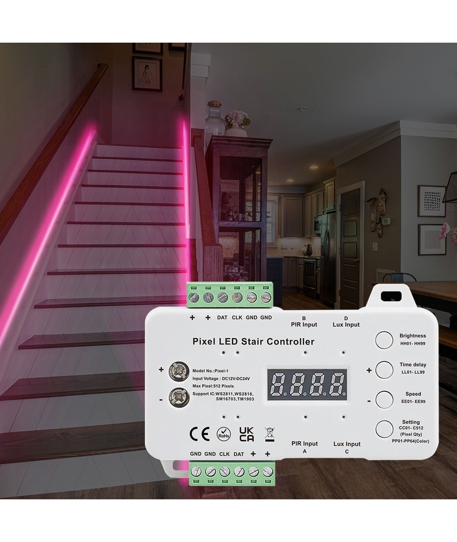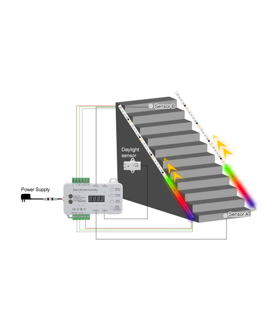 Denna intelligenta kontrollcentral ger dig full kontroll över din trappbelysning. Anpassa ljusmönster och ljusstyrka med lätthet med den medföljande sensorn.