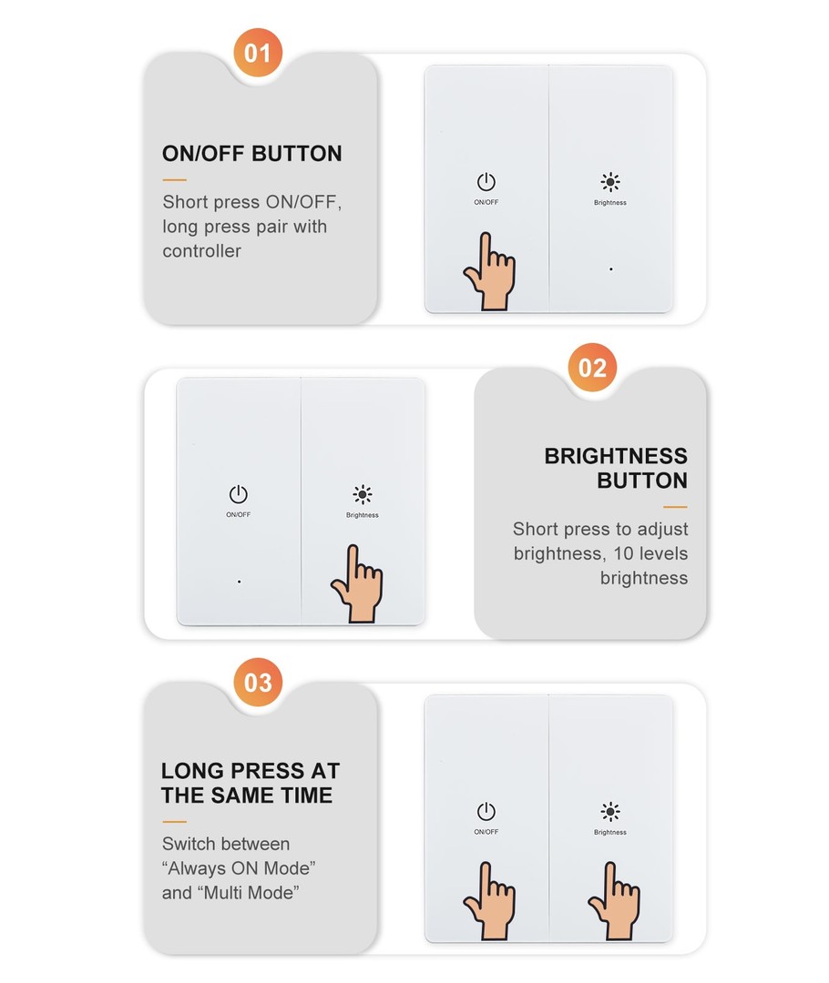 Via den medföljande fjärrkontrollen/omkopplaren kan ljusstyrkan justeras, och den kan växlas mellan att sensorn är aktiv eller att ljuset tänds/släcks vid strömbrytaren.