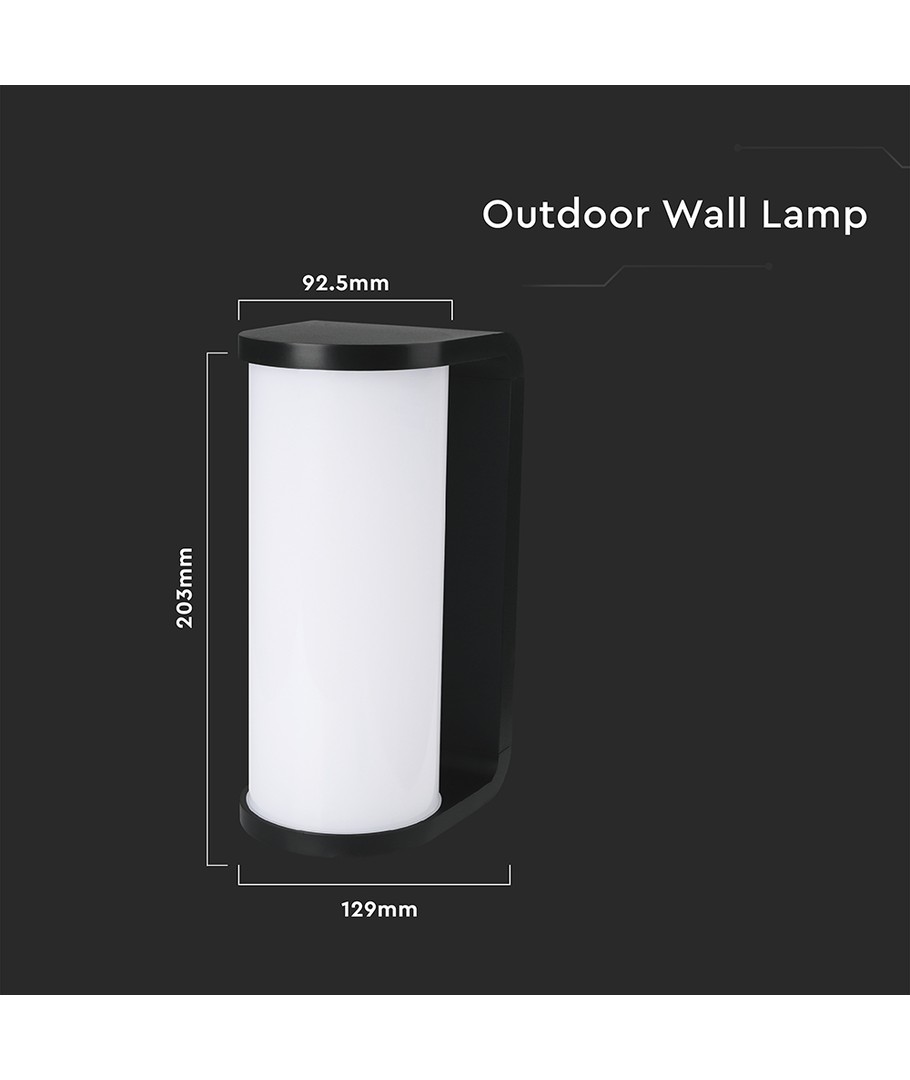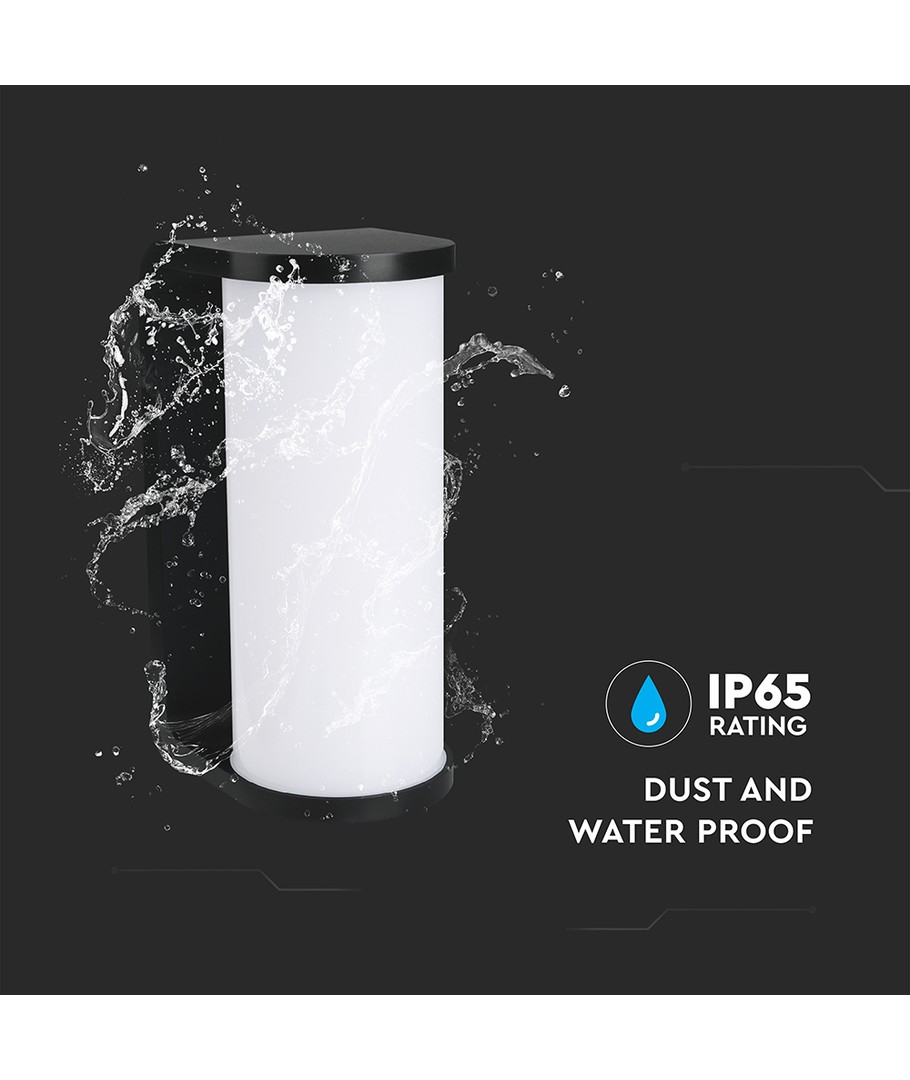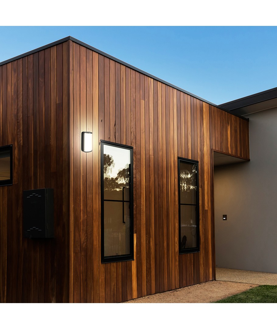 Designen är både modern och praktisk, med dimensioner på 203 x 92.5 x 129 mm, vilket gör den lätt att montera och passar in i olika miljöer. Det robusta svarta huset kombinerar estetik med hållbarhet, och IP65-klassningen innebär att den är vädertålig och kan användas utomhus, utan att påverkas av vattenstänk eller regn.