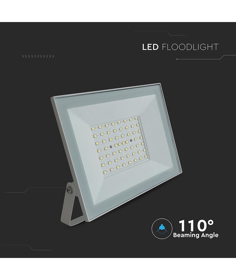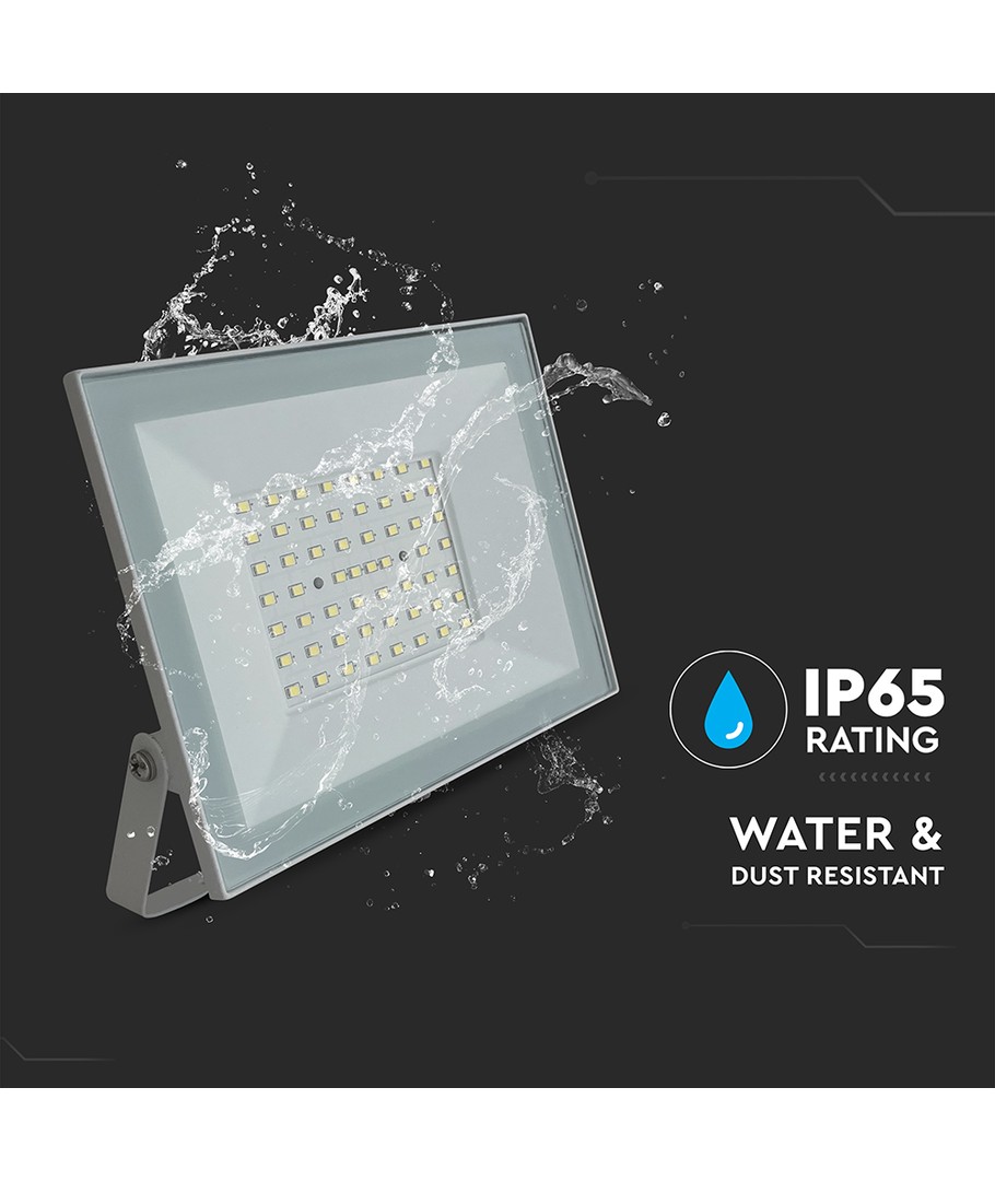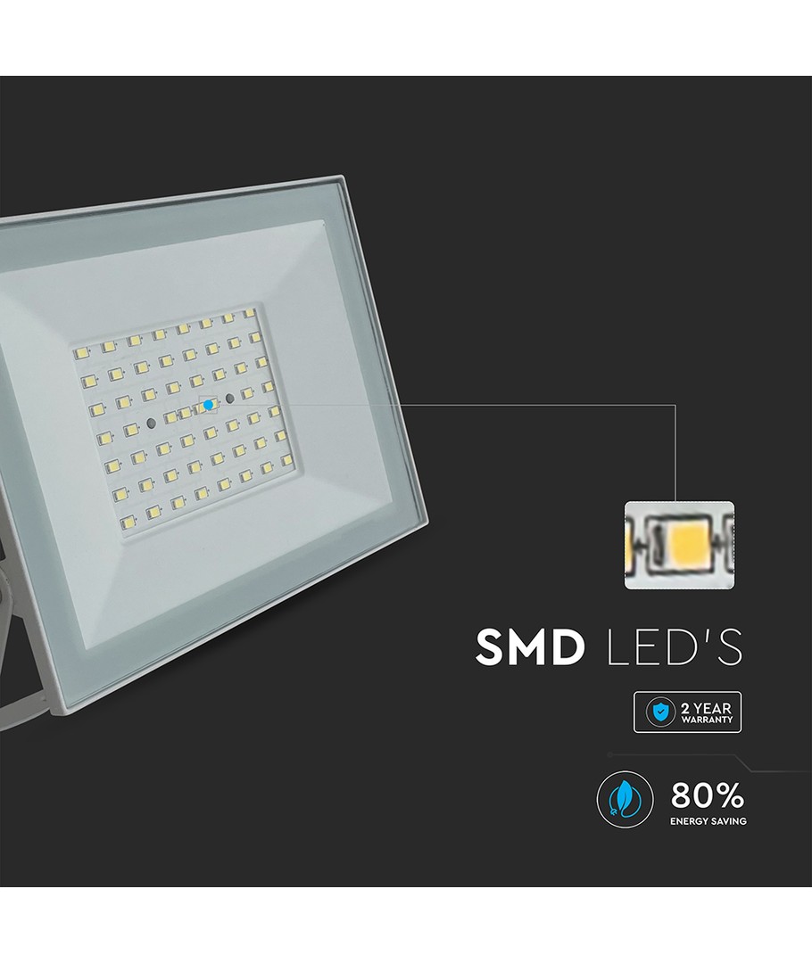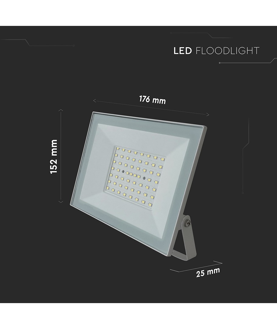 Denna LED projektor på 50W är en kraftfull och mångsidig belysningslösning som passar för en rad olika applikationer, både inom- och utomhus. Med sitt vita hus och moderna design blir den ett stilrent inslag i alla miljöer.