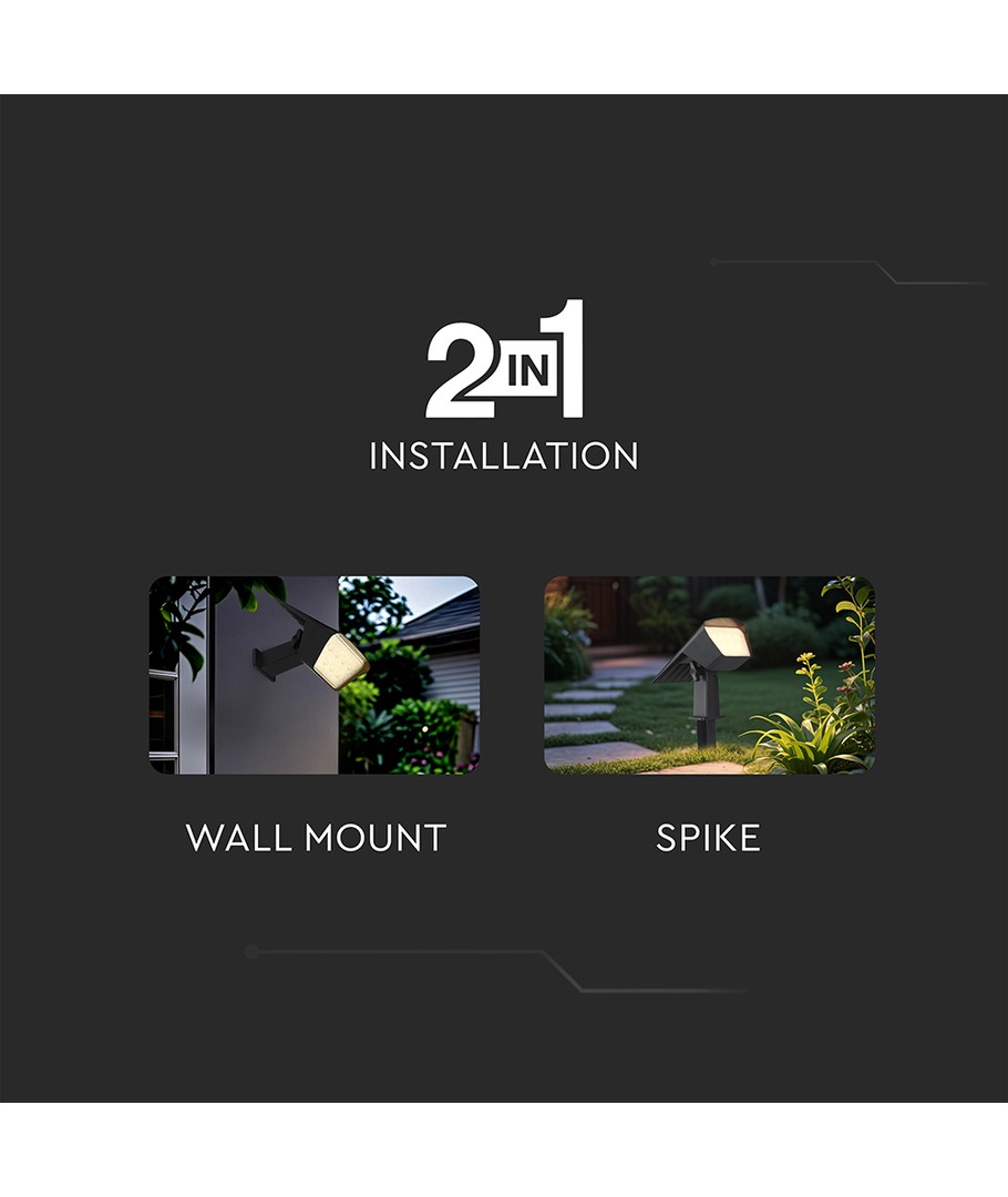 Den flexibla 2-i-1 designen gör det möjligt att välja mellan spjutmontering för trädgården och väggmontering, vilket ger fler alternativ för att anpassa belysningen till ditt utomhusutrymme.