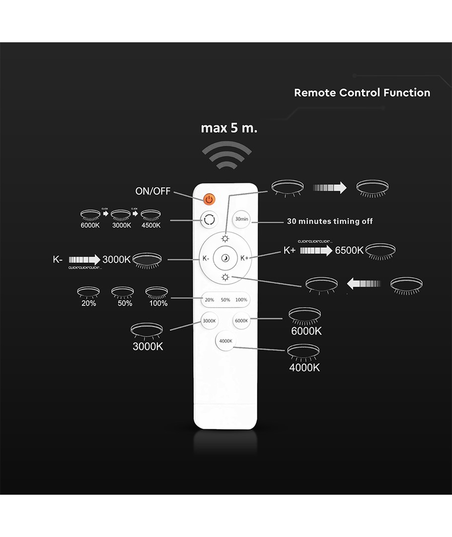 EgenskaperDenna taklampa är utrustad med en 3-i-1 funktion som låter dig justera ljusinställningarna för olika stämningar. Med den medföljande IR fjärrkontrollen kan du enkelt ändra ljusintensitet och färgtemperatur efter behov.