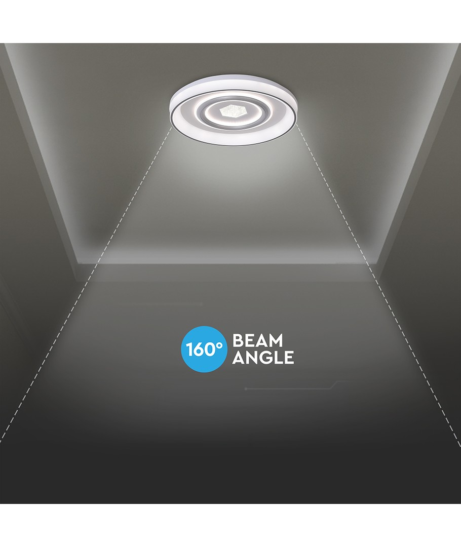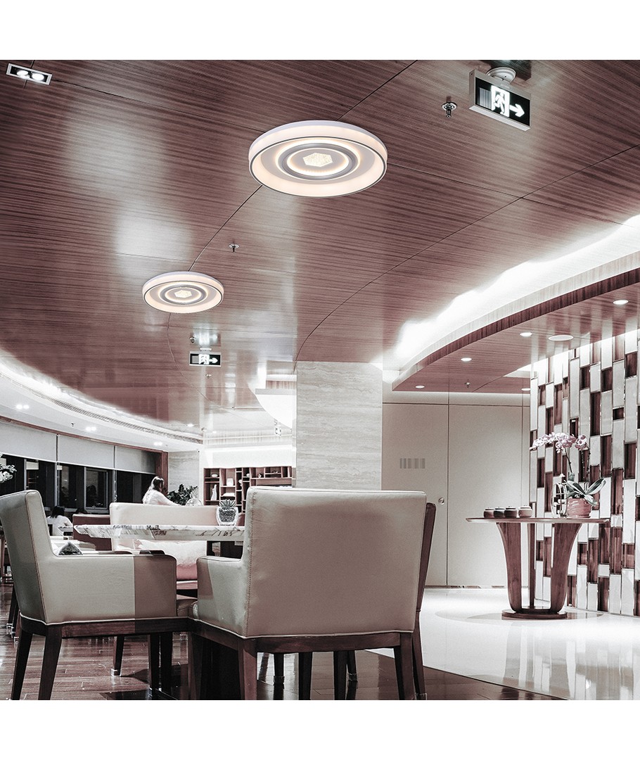 Denna taklampa är utrustad med en integrerad ljuskälla som gör installationen enkel och smidig. Med IR-fjärrkontrollen kan du enkelt justera ljusstyrkan och skapa den perfekta atmosfären i ditt hem. Dess 3-i-1 funktioner ger flexibilitet för olika belysningsbehov.