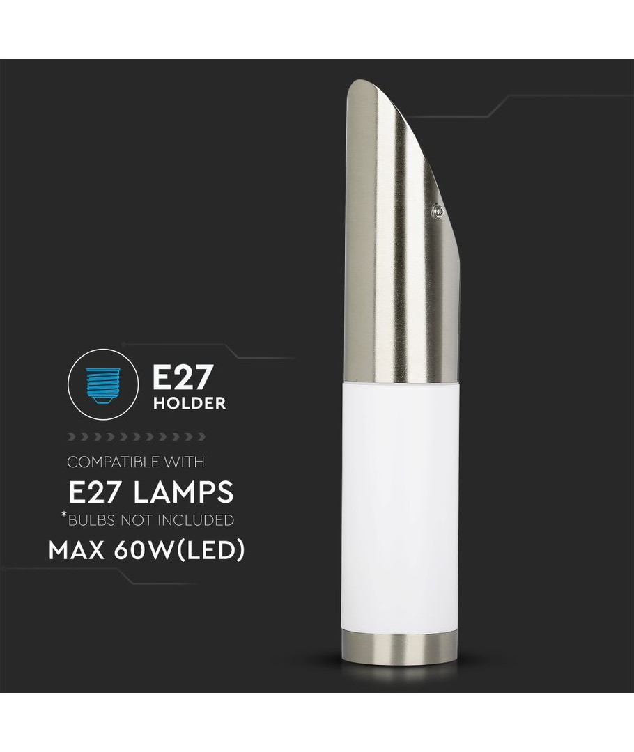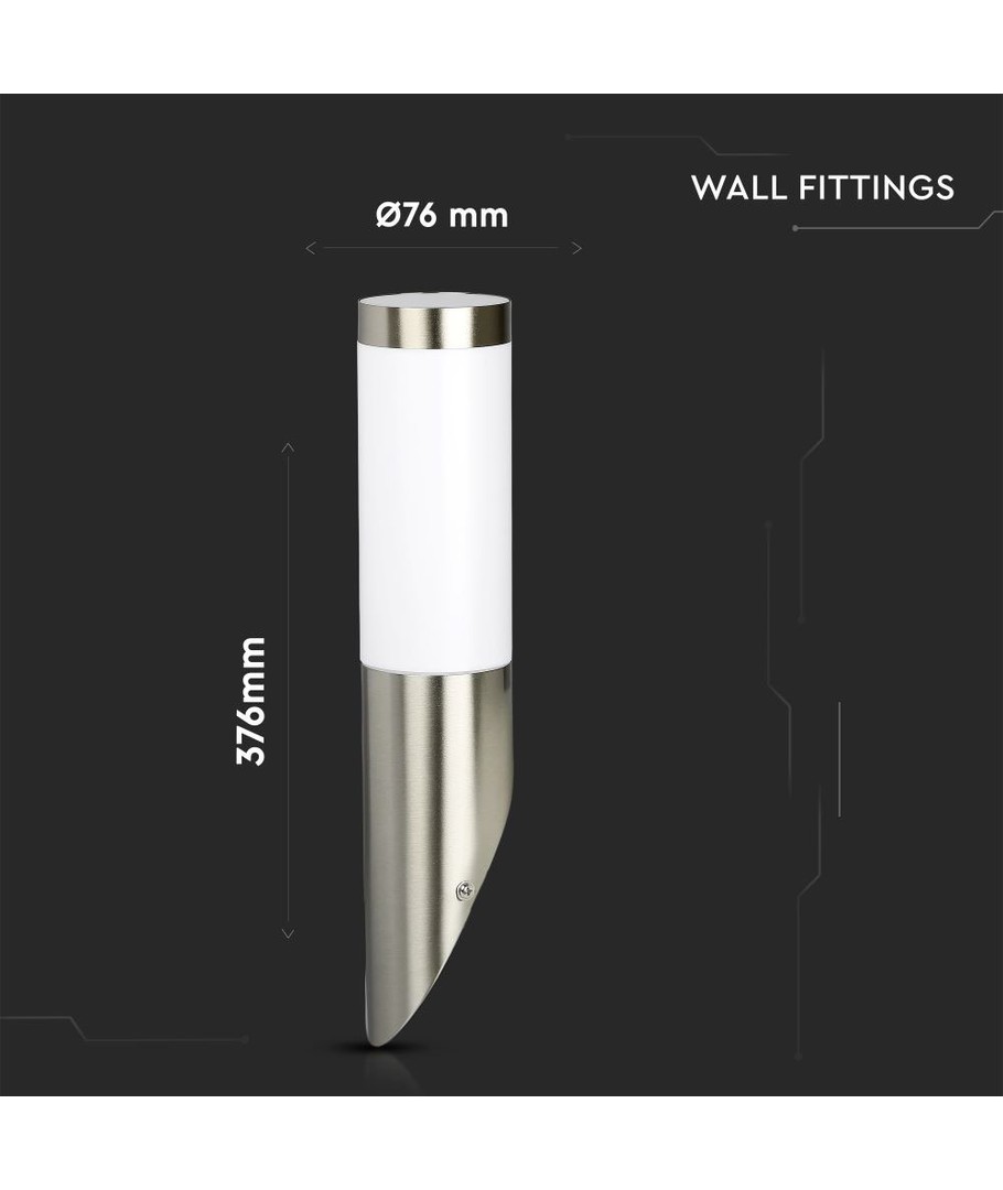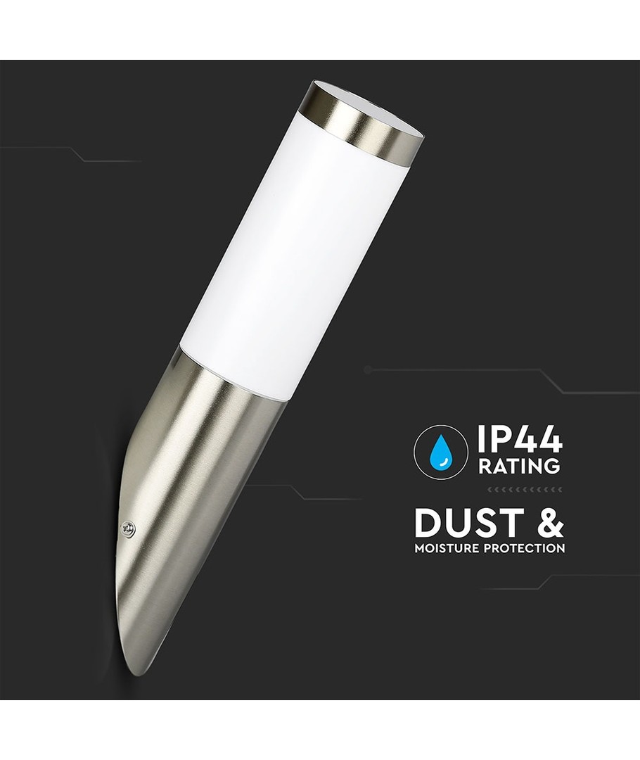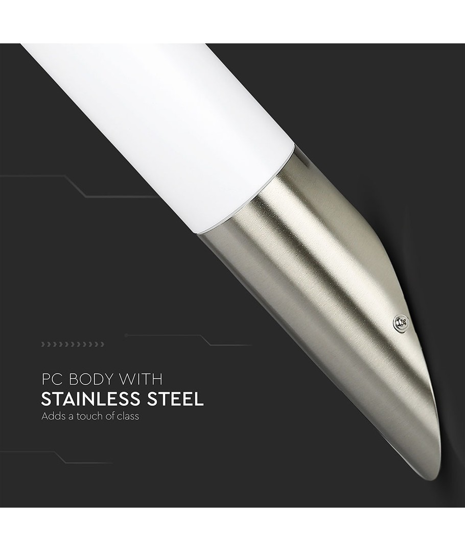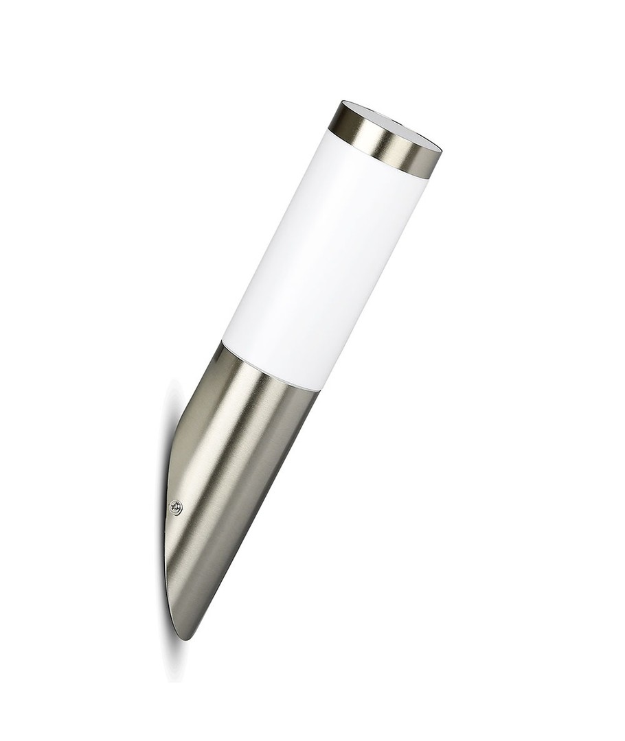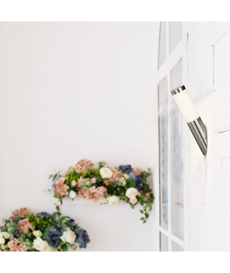 Lampan har en modern och minimalistisk design med ett hus i rostfritt stål, vilket ger den ett elegant utseende och utmärkt hållbarhet. Den diagonala vinkeln på lampan skapad för att optimera ljusspridningen och ge ditt hem en inbjudande atmosfär.