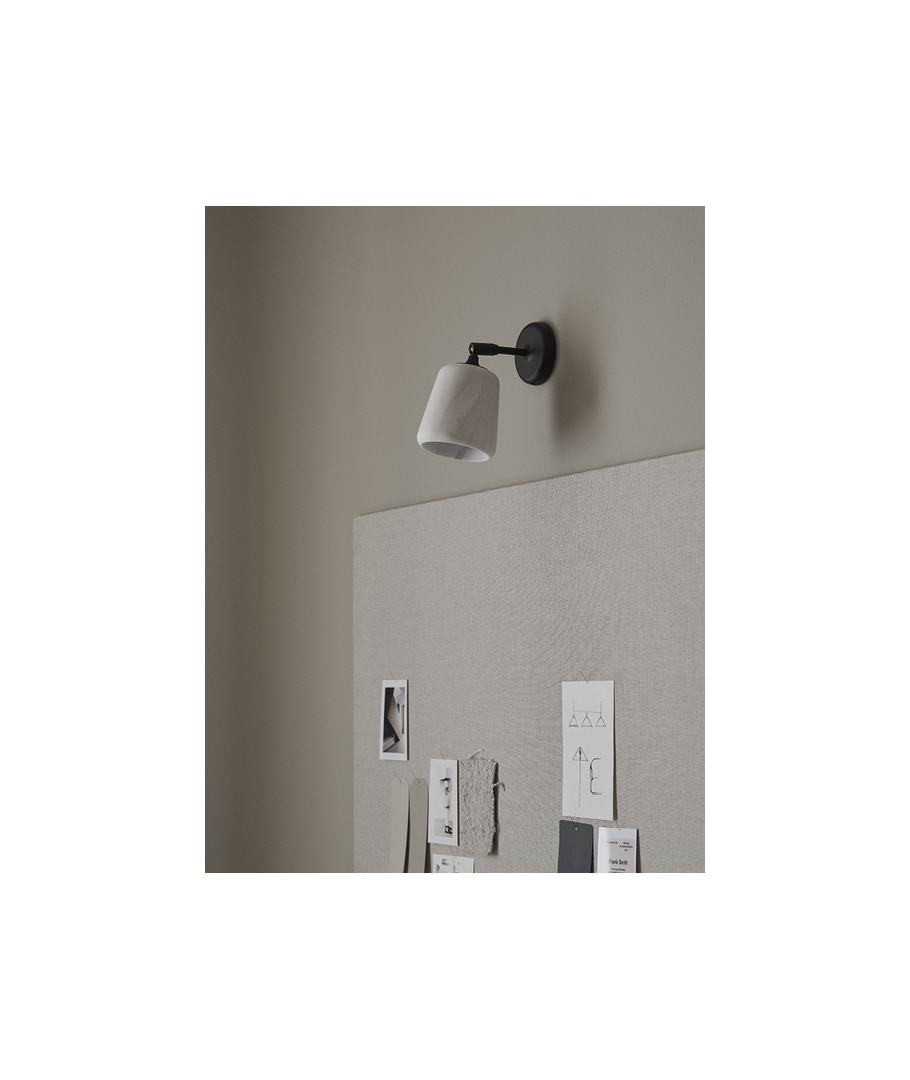 Skærm og fatning sidder på væggen i en kort arm i sort stål, med et kipled så lampen kan justeres.