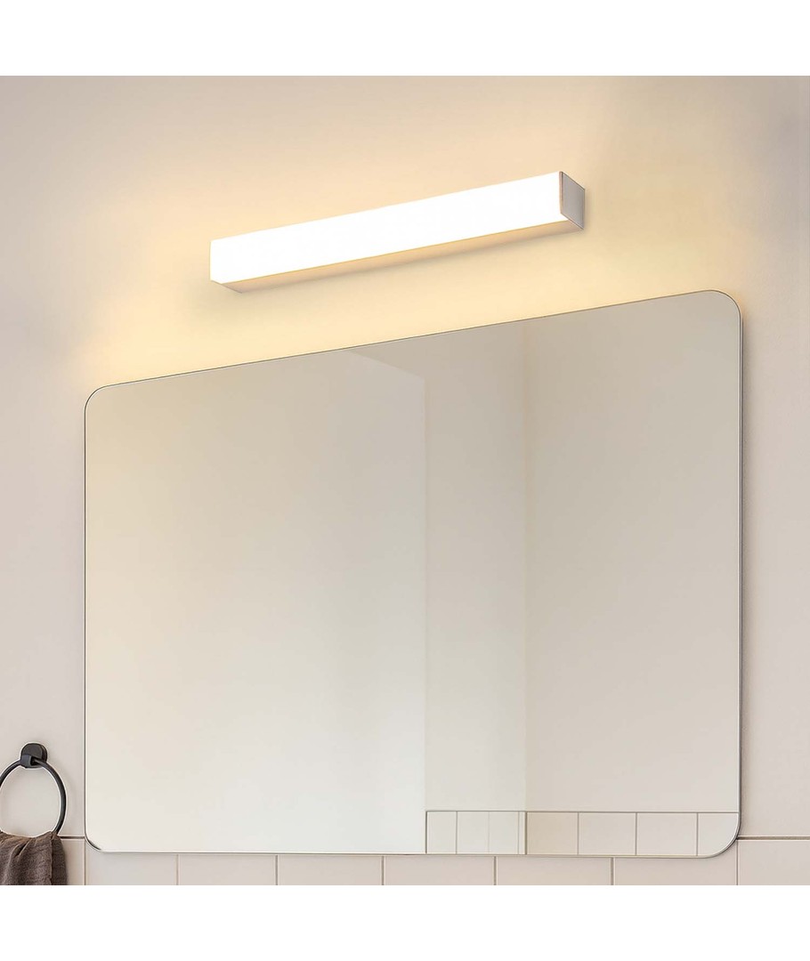 Med dess IP44-konstruktion är lampan skyddad mot fuktig luft och vattenstänk på framsidan, vilket gör den idealisk för användning i badrum. Den smidiga designen och den högkvalitativa ljusspridningen gör den till ett stiligt tillskott i vilket rum som helst.